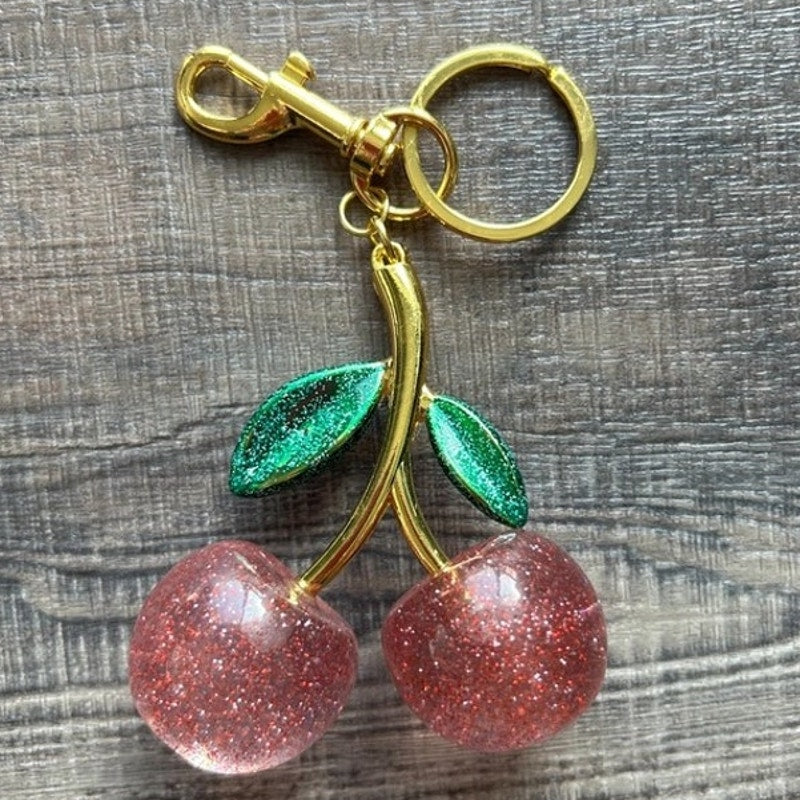 Cherry Bag Purse Charm Keychain Glitter Pink Gold Painted Leaves