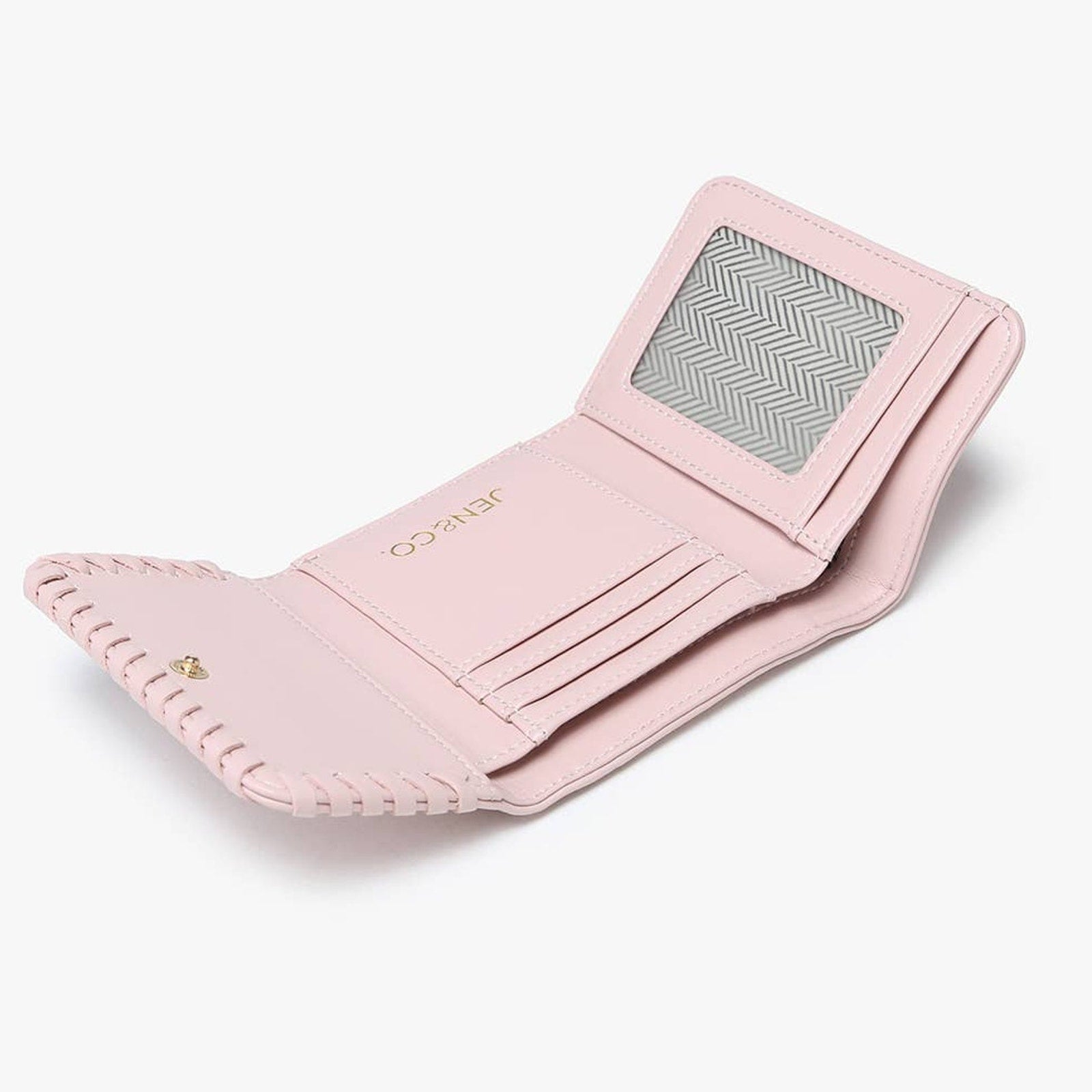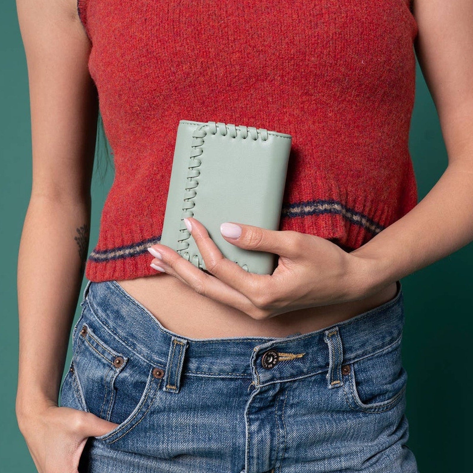 This tri-fold wallet offers both style and functionality with its whipstitch detailing and practical interior featuring an ID holder and card slots, all crafted from vegan leather for a cruelty-free accessory option.