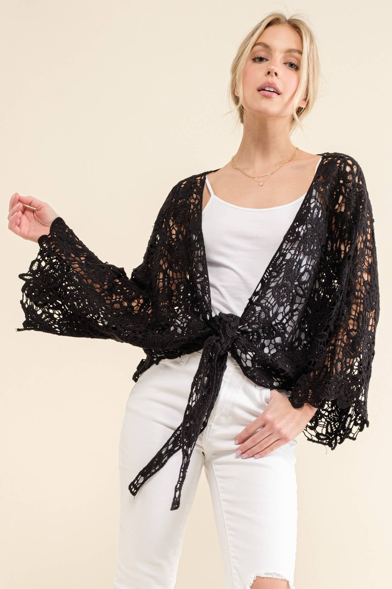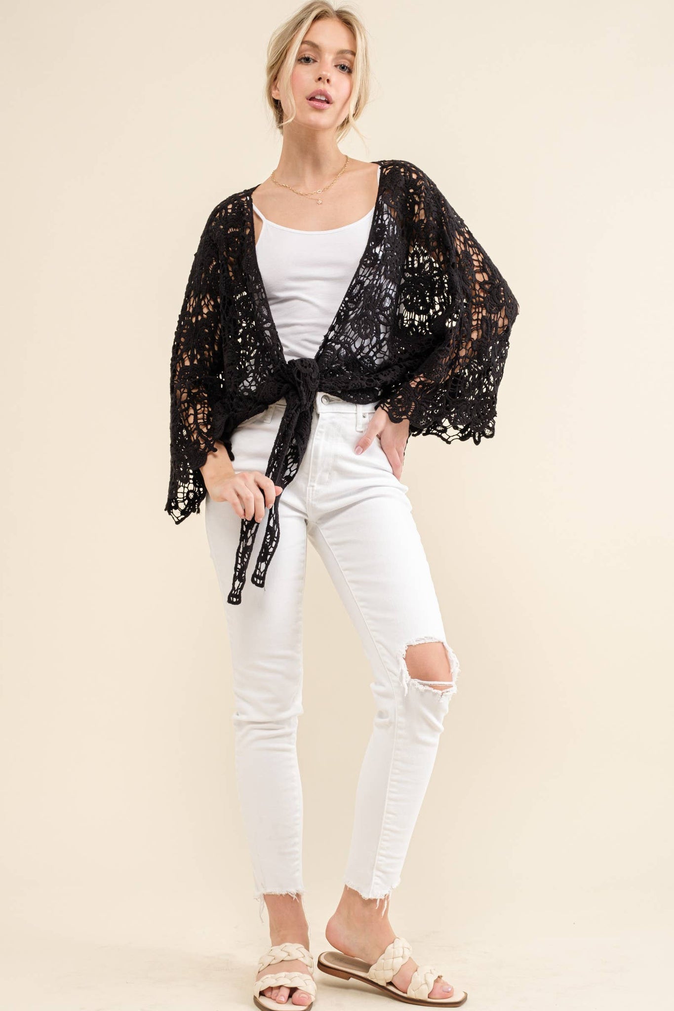 Boho Cotton Lace Tie Front Wrap Lace Top Black