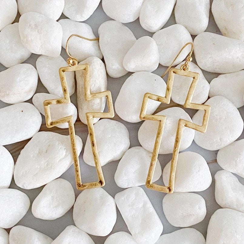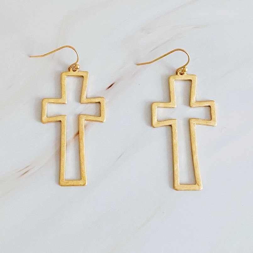 These Dangle Cross Earrings are sure to add the perfect amount of edge to any outfit. Crafted with a hammered matte finish, they are lightweight yet robust for all-day wear. Their eye-catching cut out cross design makes them stand out from other statement earrings.