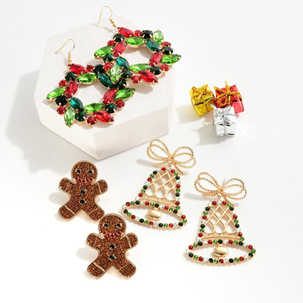 Bling Rhinestone Crystal Statement Christmas Bow Bell Earrings