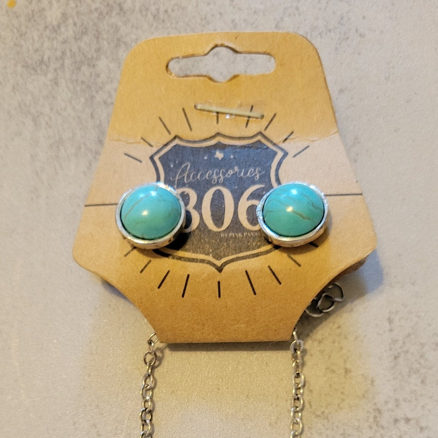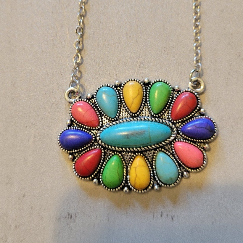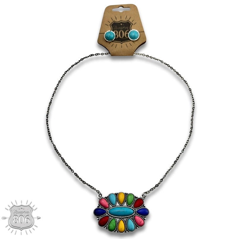 This western style jewelry set includes a multi-color stone sideways flower pendant on chain with round turquoise color post earrings.
