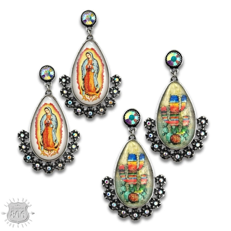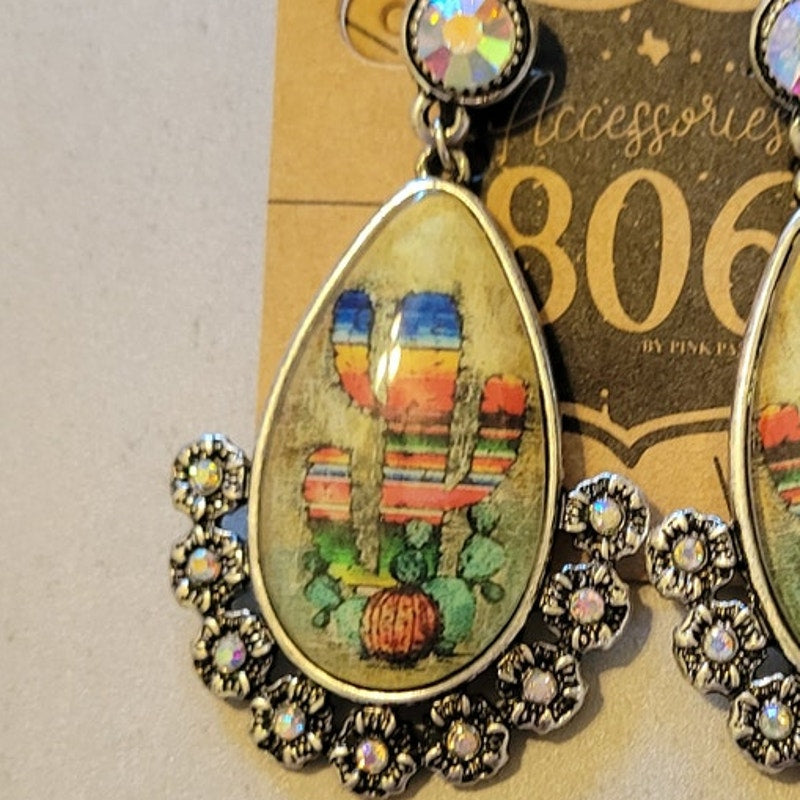 Scenic Southwest Western Cactus Acrylic Rhinestone Teardrop Earrings