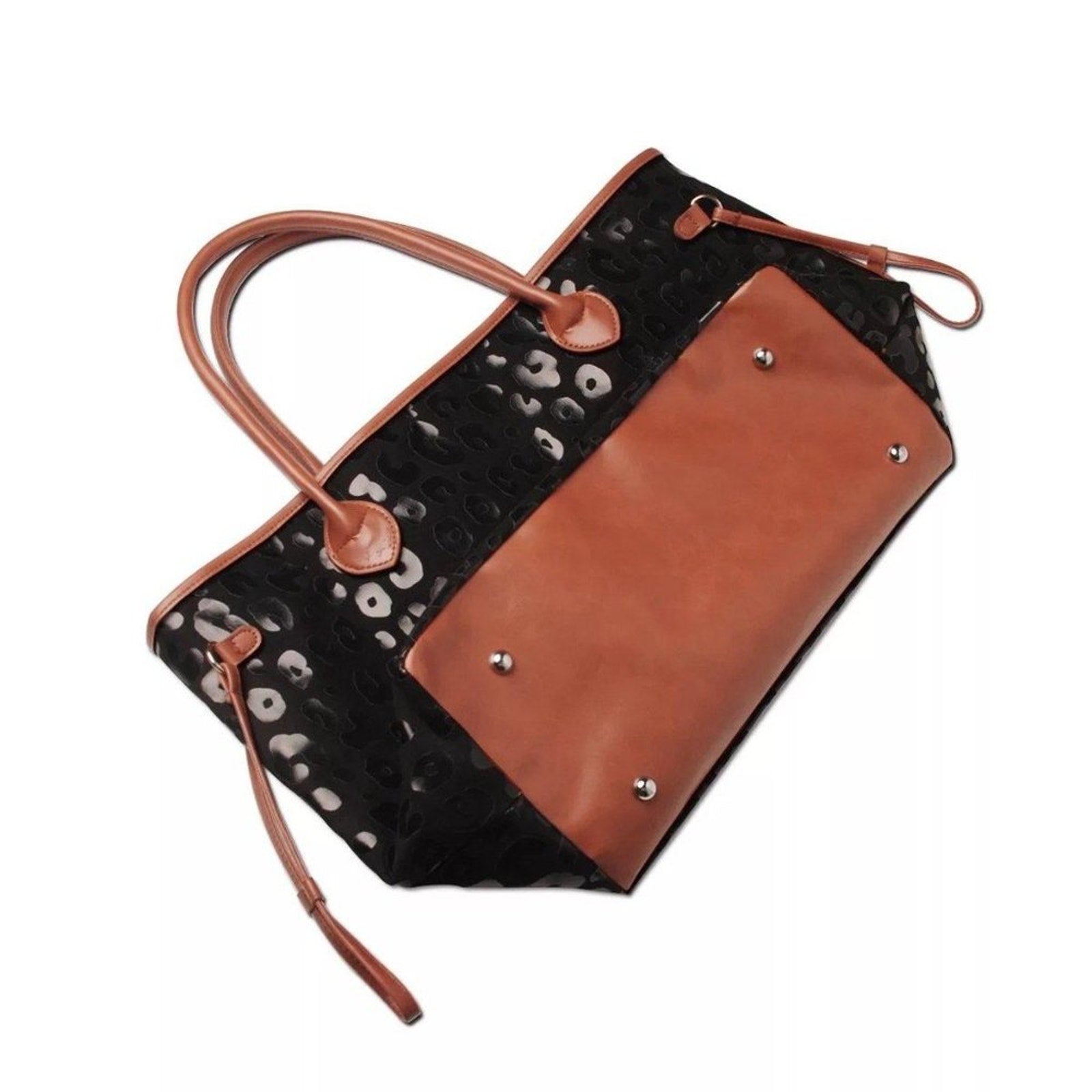 Black Leopard Canvas Large Tote Bag w Brown Accent