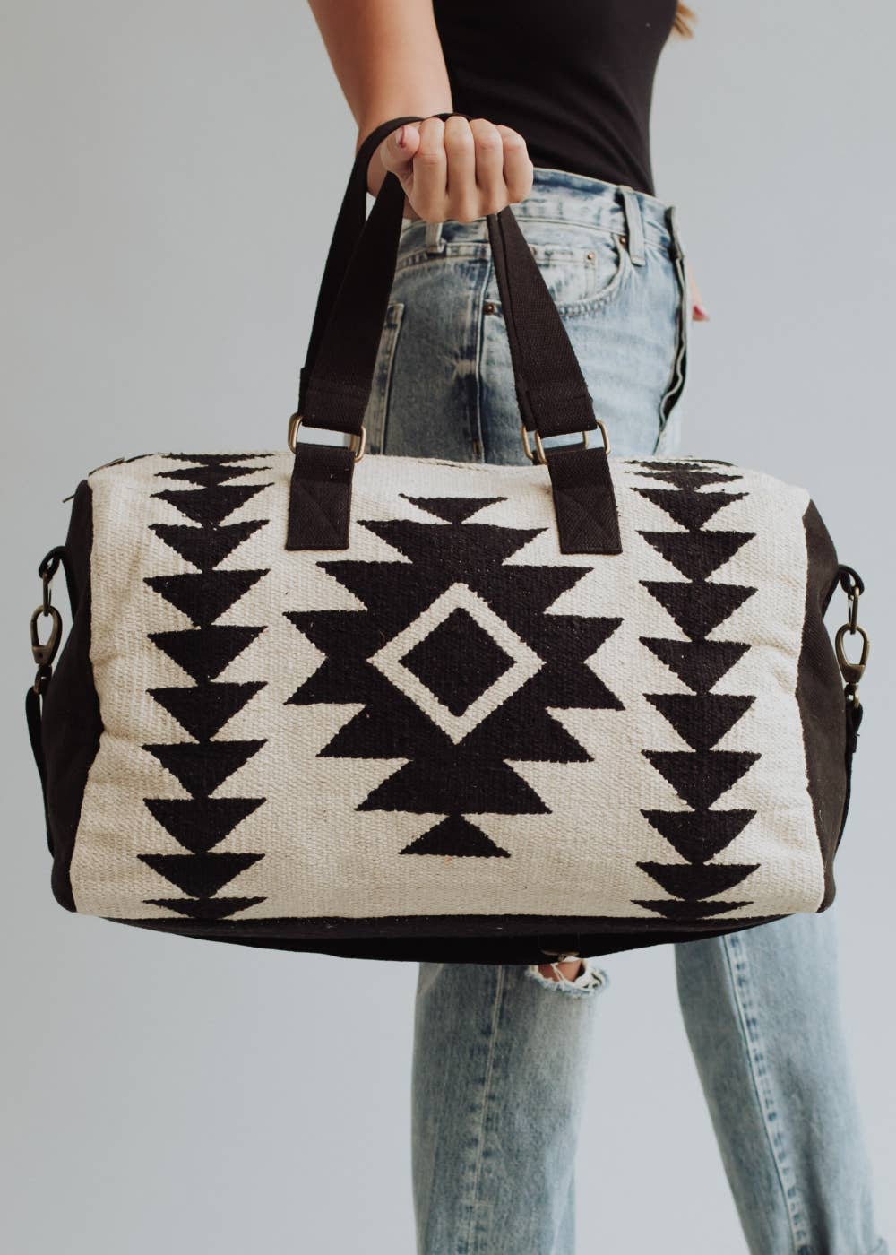 Western Aztec Woven Cotton Duffel Travel Bag Cream Black