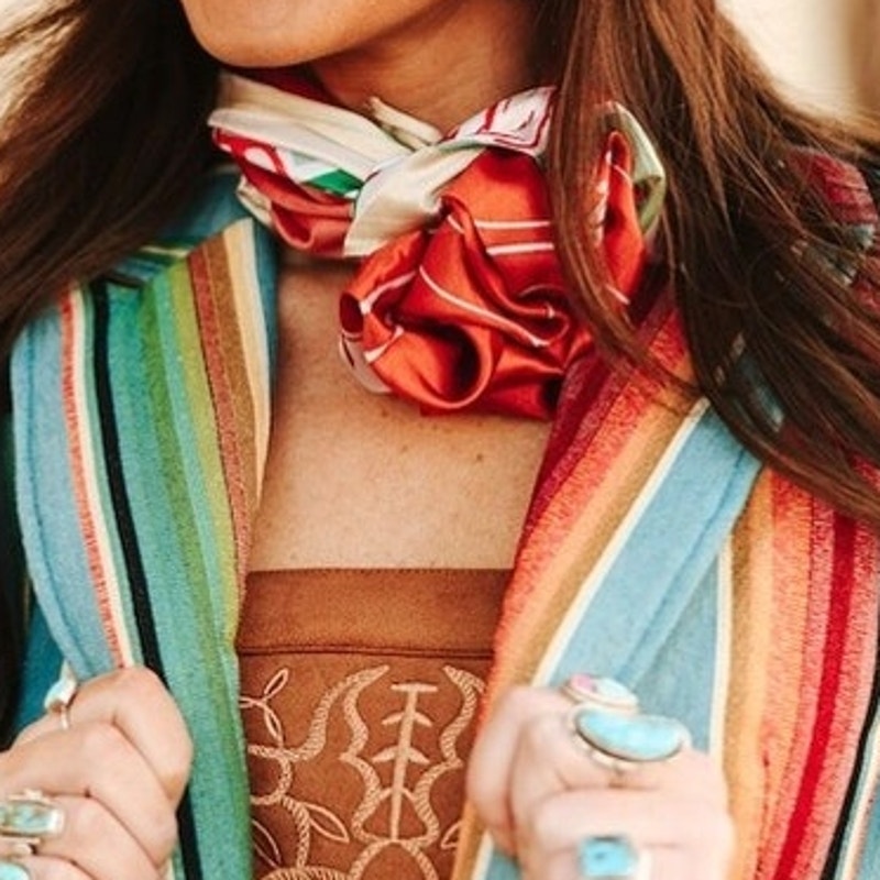 This bold western wild rag is a true cowgirl statement piece, designed to elevate any western outfit with color, movement, and tradition. Featuring rich coral tones framed with contrasting mint and cream borders, this wild rag showcases striking western-inspired artwork that draws the eye from every angle. Crafted from a smooth, lightweight fabric, it drapes beautifully and ties effortlessly around the neck, over the shoulders, or as a head wrap. Perfect for pairing with denim, boots, and turquoise jewelry,