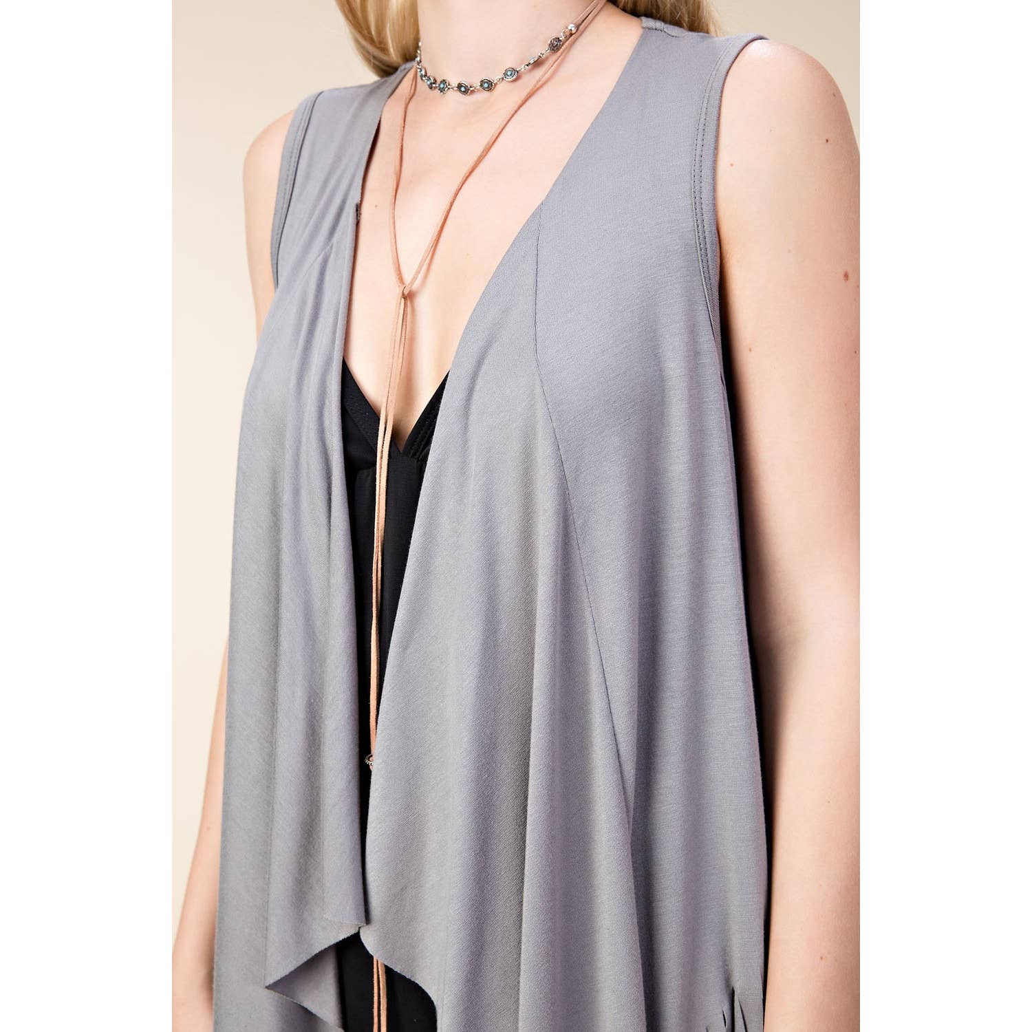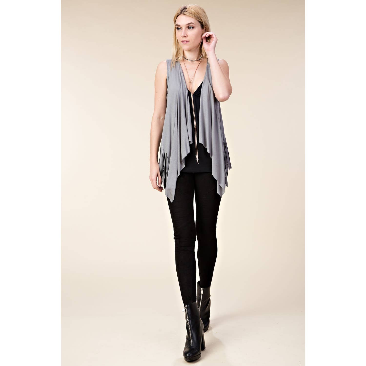 Channel authentic Western spirit with the Open Front Draped Vest with Fringe Hem and Bullhead Print in Grey. This sleeveless vest is a statement piece that brings rugged elegance to any outfit, featuring a flowing open front silhouette that drapes beautifully over your favorite tops. The fringe hem adds movement and texture, while the embellished bullhead print on the back makes a bold, unmistakable nod to Western heritage.