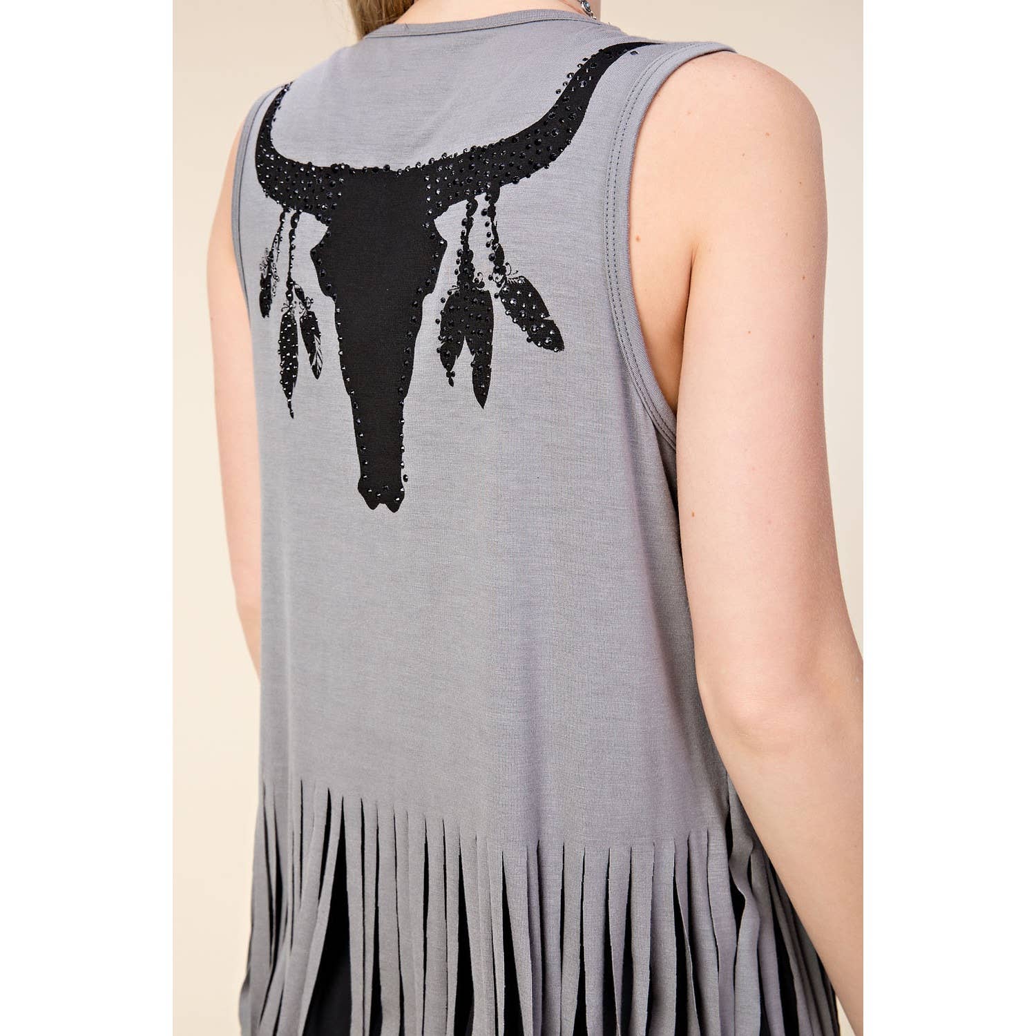 Open Front Draped Vest with Fringe Hem and Bullhead Print in Grey