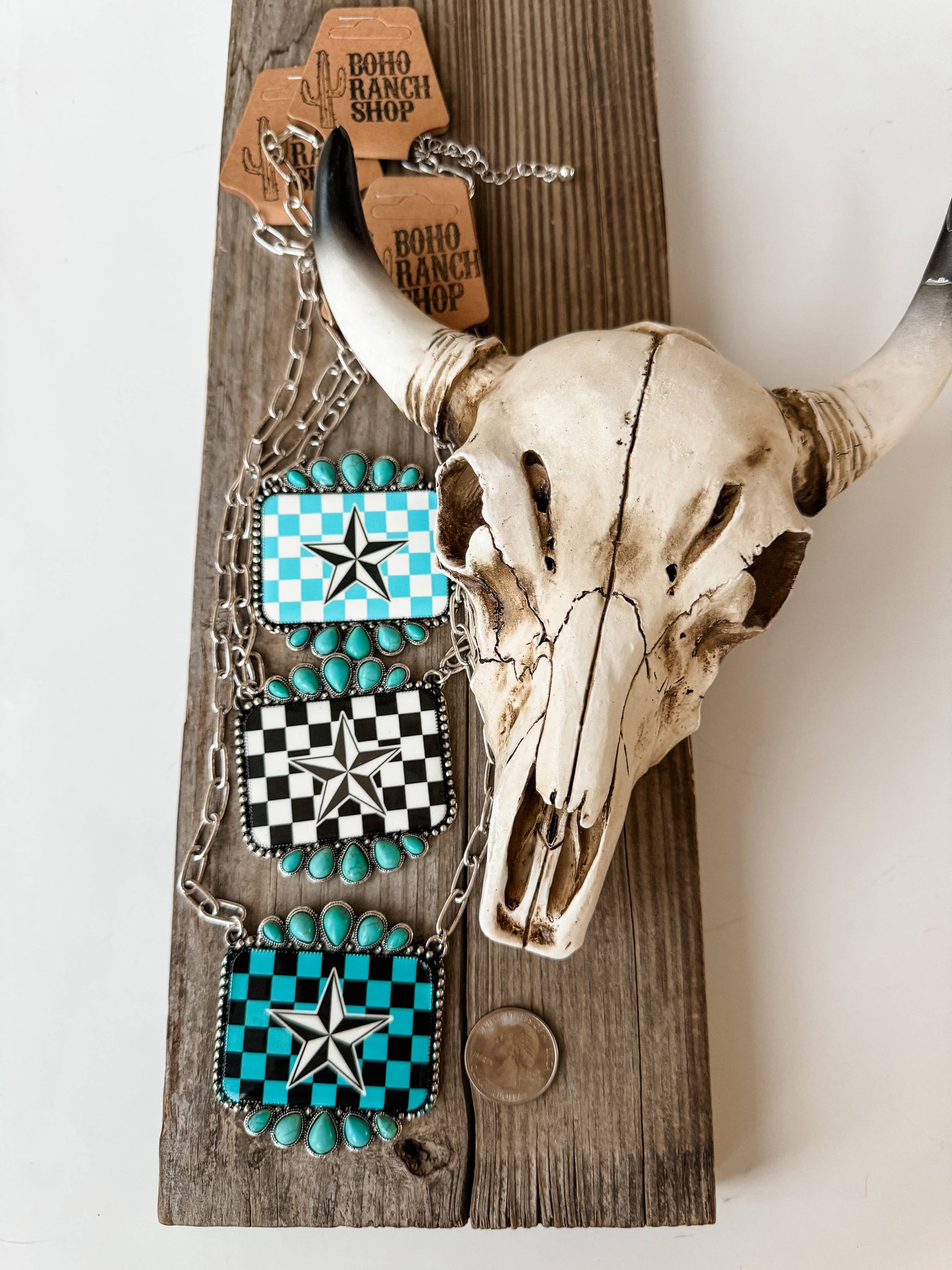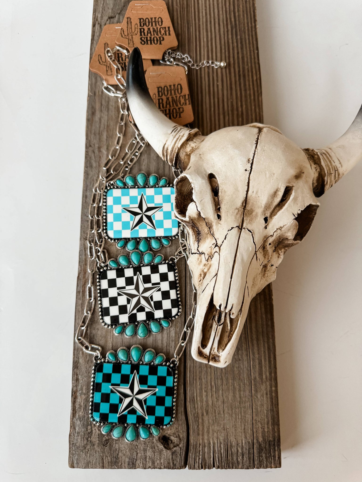 Western Checkered Star Pendant Necklace Black Turquoise