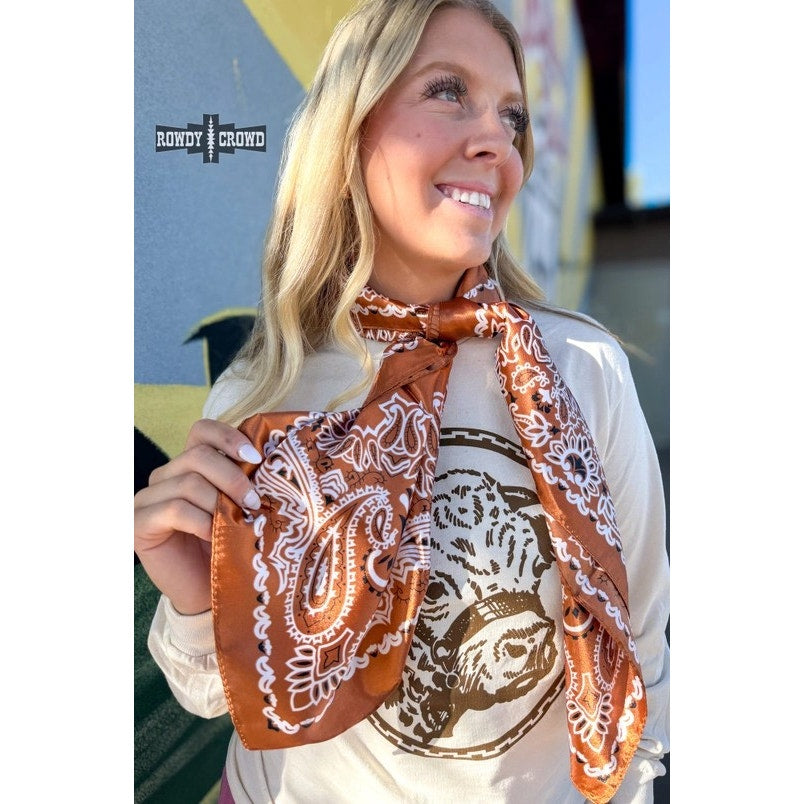 Turn up the western charm with the Cowboy Copper Wild Rag. This silky smooth wild rag features a rich copper hue accented with a classic white paisley print that’s both timeless and bold. Its soft, satin-like feel makes it perfect for dressing up your everyday denim or adding polish to your rodeo-ready fit.