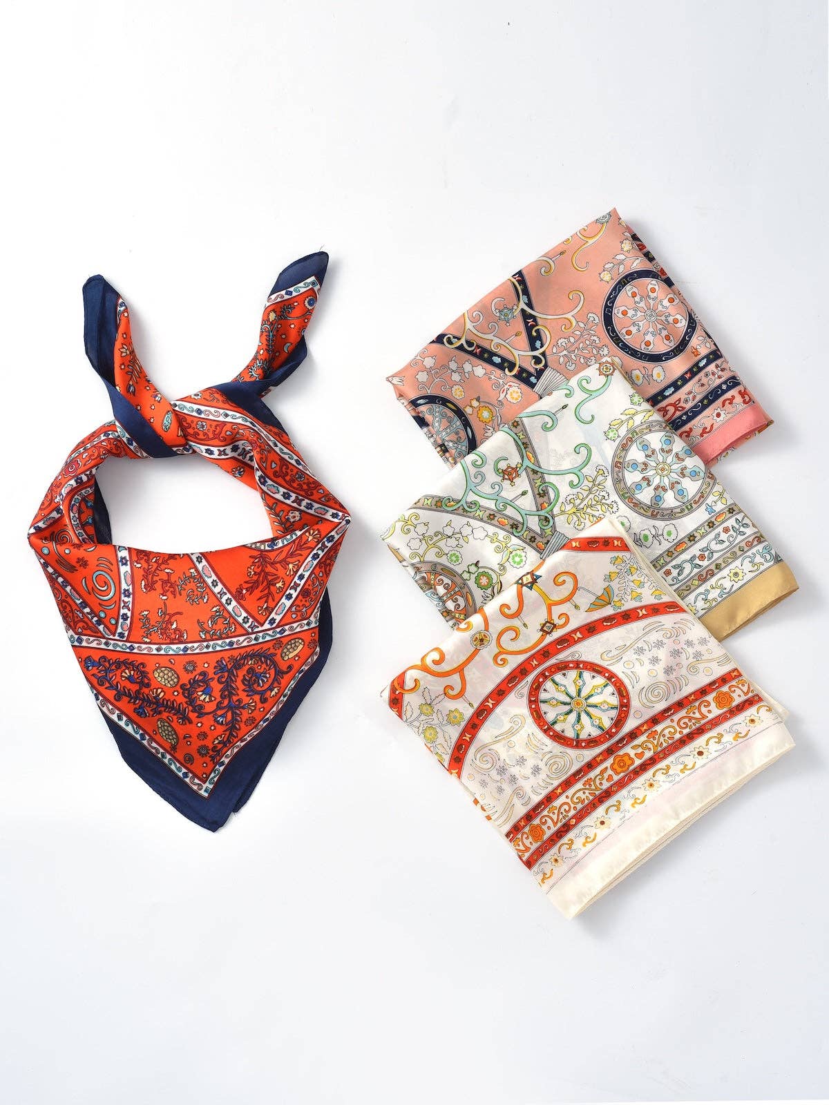 The Vintage Pattern Square Scarf pairs ornate motifs with vivid contrast borders, evoking timeless style in a modern boutique setting.