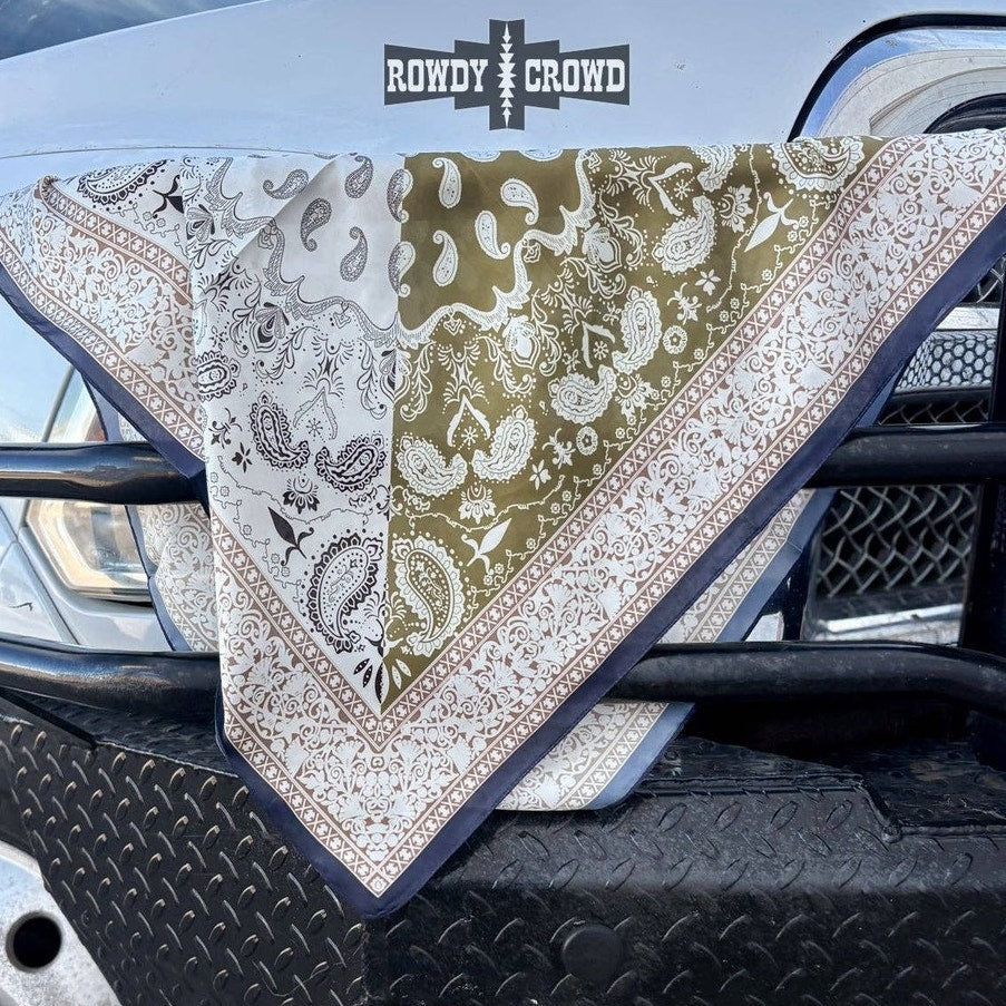 The SMALL Sendero Wild Rag brings a soft, earthy palette to your western wardrobe with a blend of olive, cream, and warm tan bandana prints framed in a classic navy border. Lightweight, silky, and easy to tie, this wild rag adds just the right touch of western charm to your look.