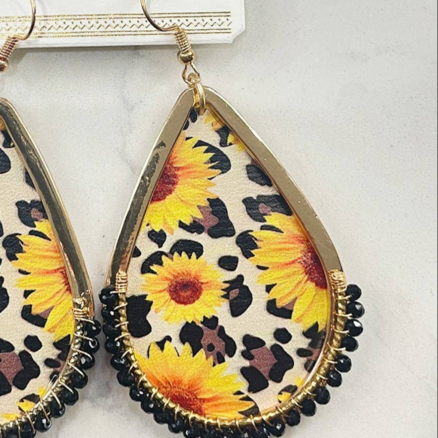 In My Daisy Dukes Sunflower Leopard Black Beads Teardrop Earrings