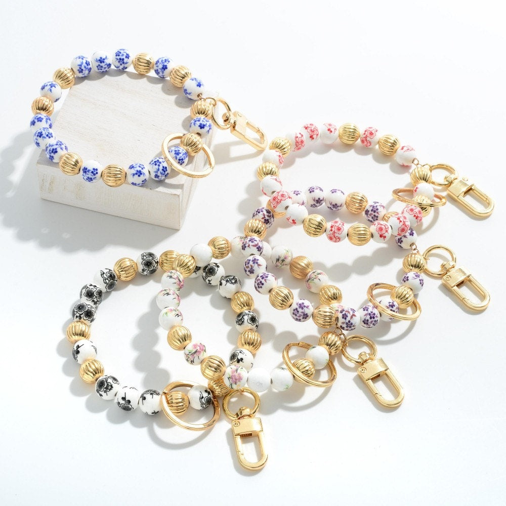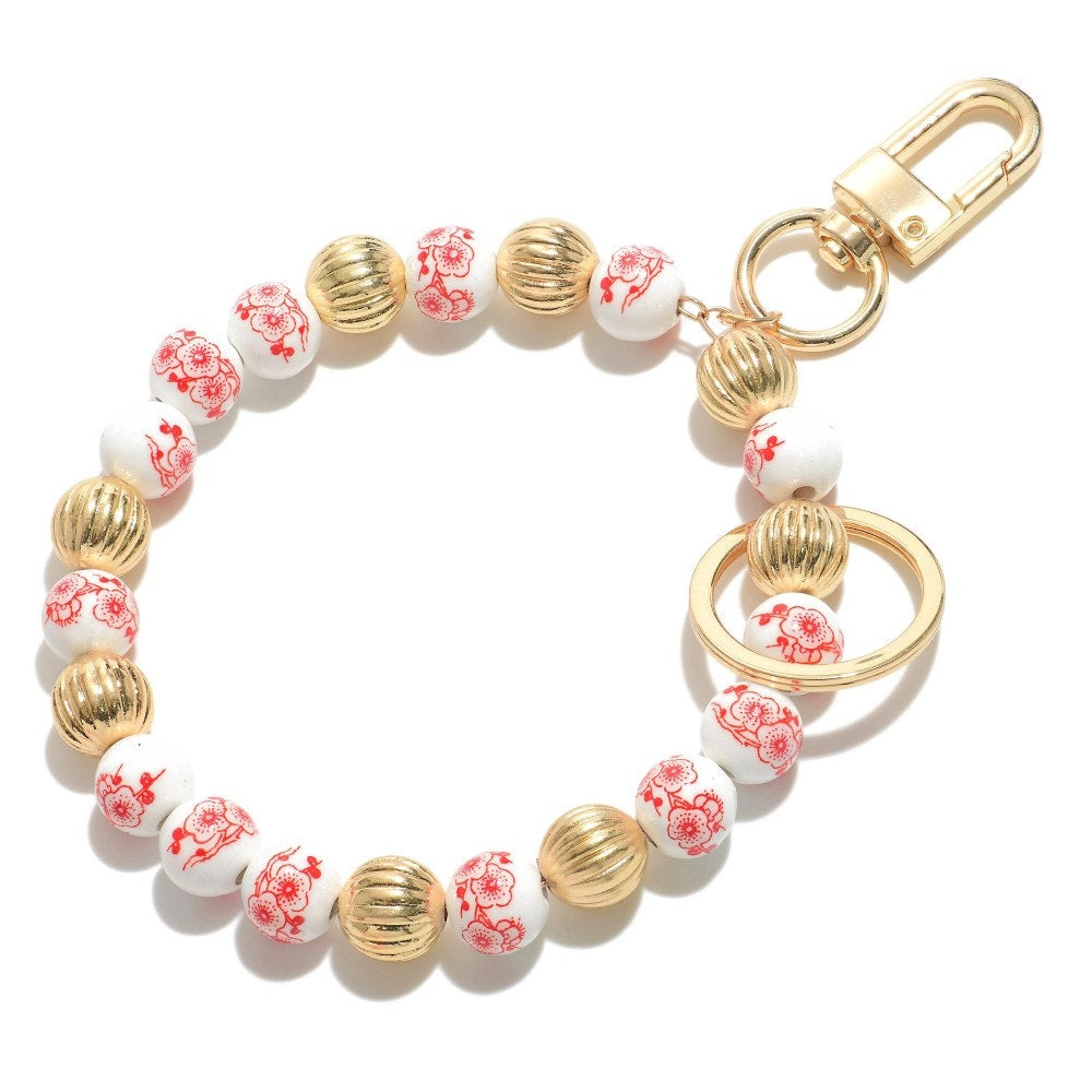 Red & White Chinoiserie Porcelain Flower Beaded Bangle Bracelet Key Ring