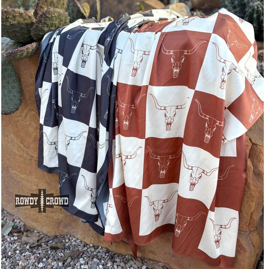 The BLACK Checkered Skull Wild Rag adds a clean, modern twist to classic western style. Featuring a bold black-and-cream checkered pattern covered in longhorn skull outlines, this silky wild rag is the perfect mix of punchy and polished. Soft, lightweight, and easy to tie, it elevates any outfit- from rodeo tees to dressy denim and turquoise