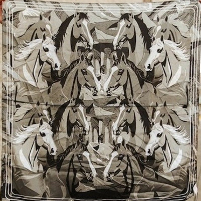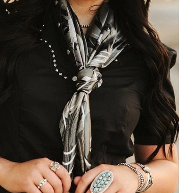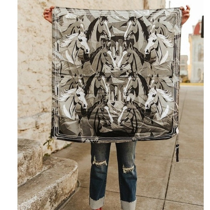 This western wild rag features a bold, symmetrical horse print in layered shades of charcoal, ivory, and soft gray for a refined yet rugged western look. The repeating equine artwork creates striking visual balance while maintaining a timeless cowgirl aesthetic. Designed with a lightweight, silky hand-feel, this wild rag drapes beautifully and styles effortlessly as a neck scarf, head wrap, or western accessory accent. A versatile neutral that pairs seamlessly with denim, leather, and classic western silhouettes.
