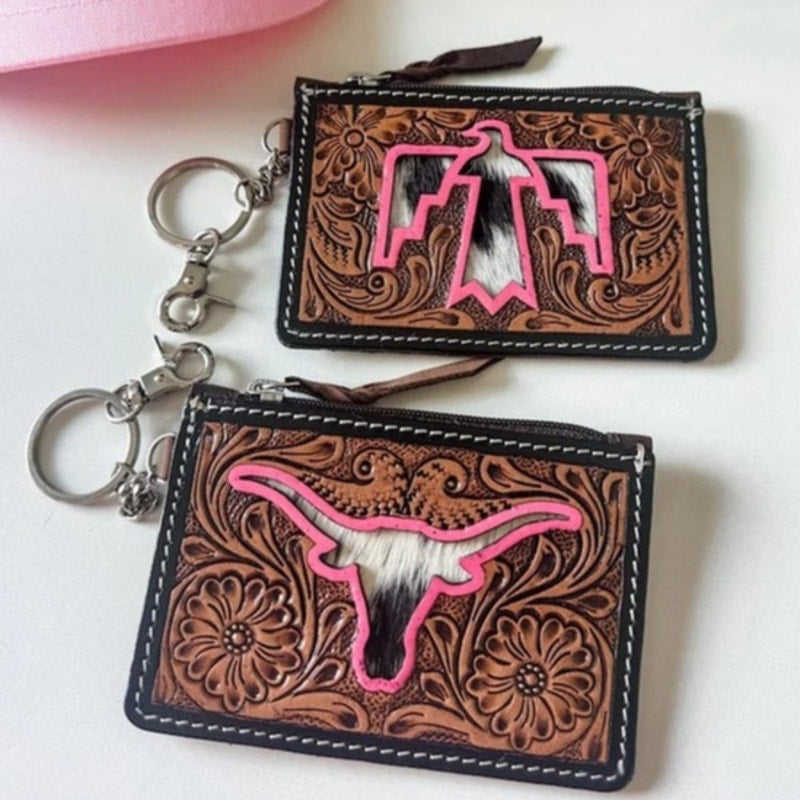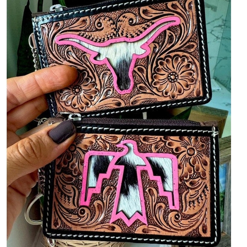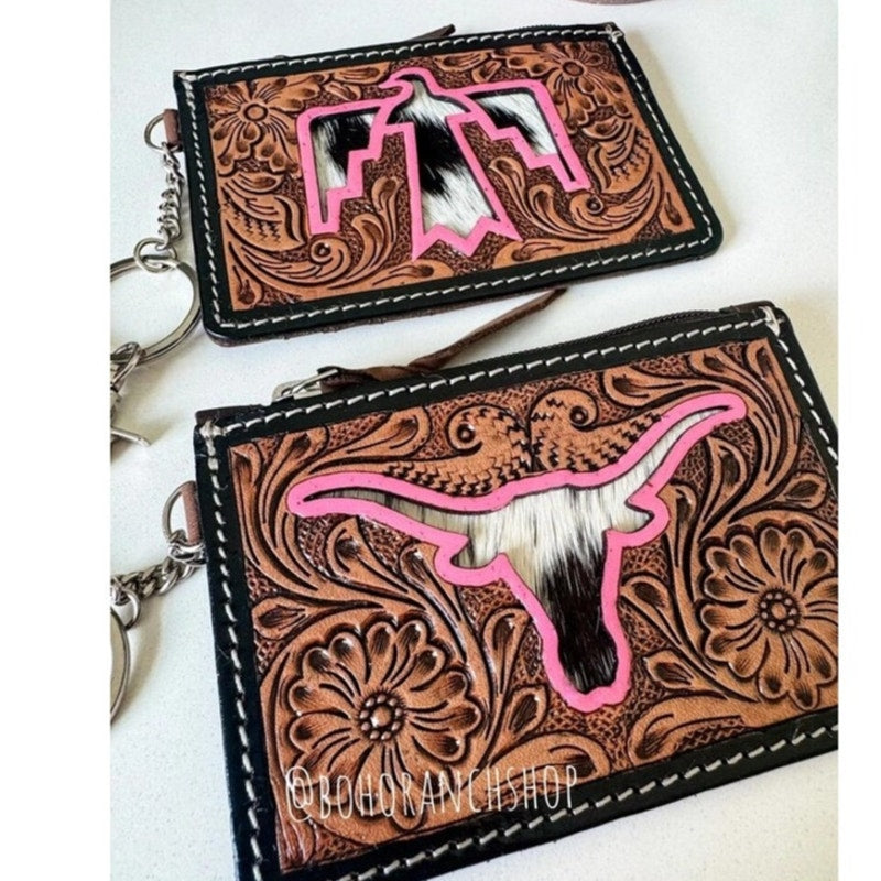Longhorn Western Cowhide Tooled Leather Keychain Wallet Pink Outline