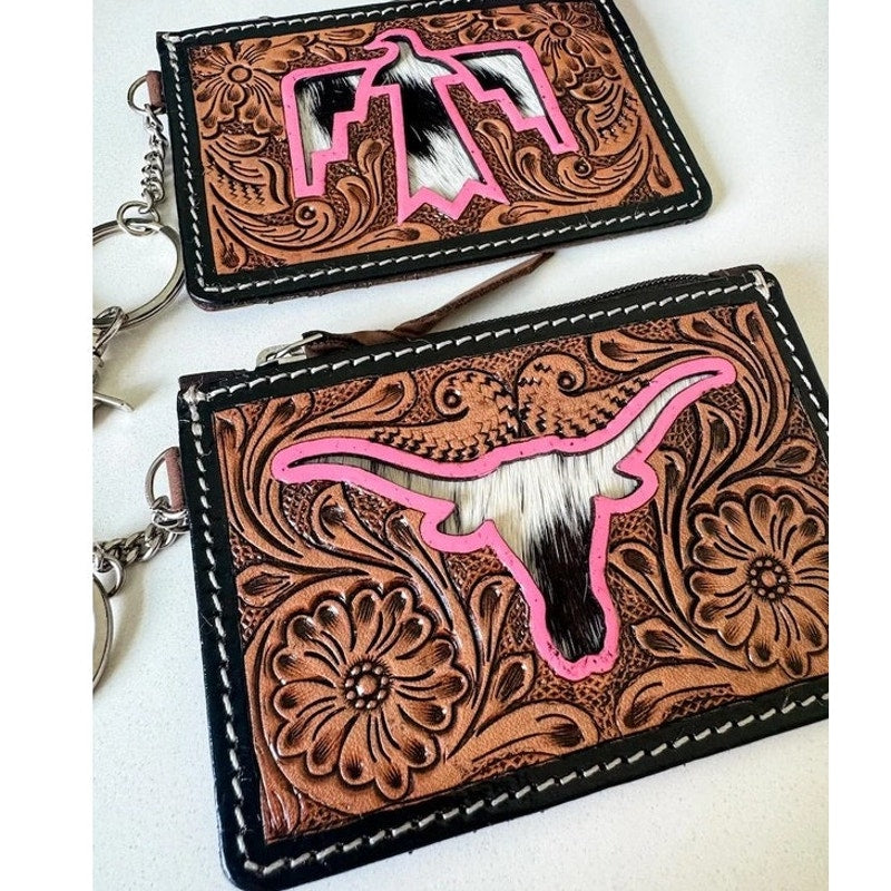 Clip this to your keychain. Throw this into a larger purse, a small handbag, diaper bag, or even your gym bag to keep organized! Front has hand tooled leather with turquoise outlined longhorn/steer with cowhide in the center approximate size: 4.5” x 3.25”