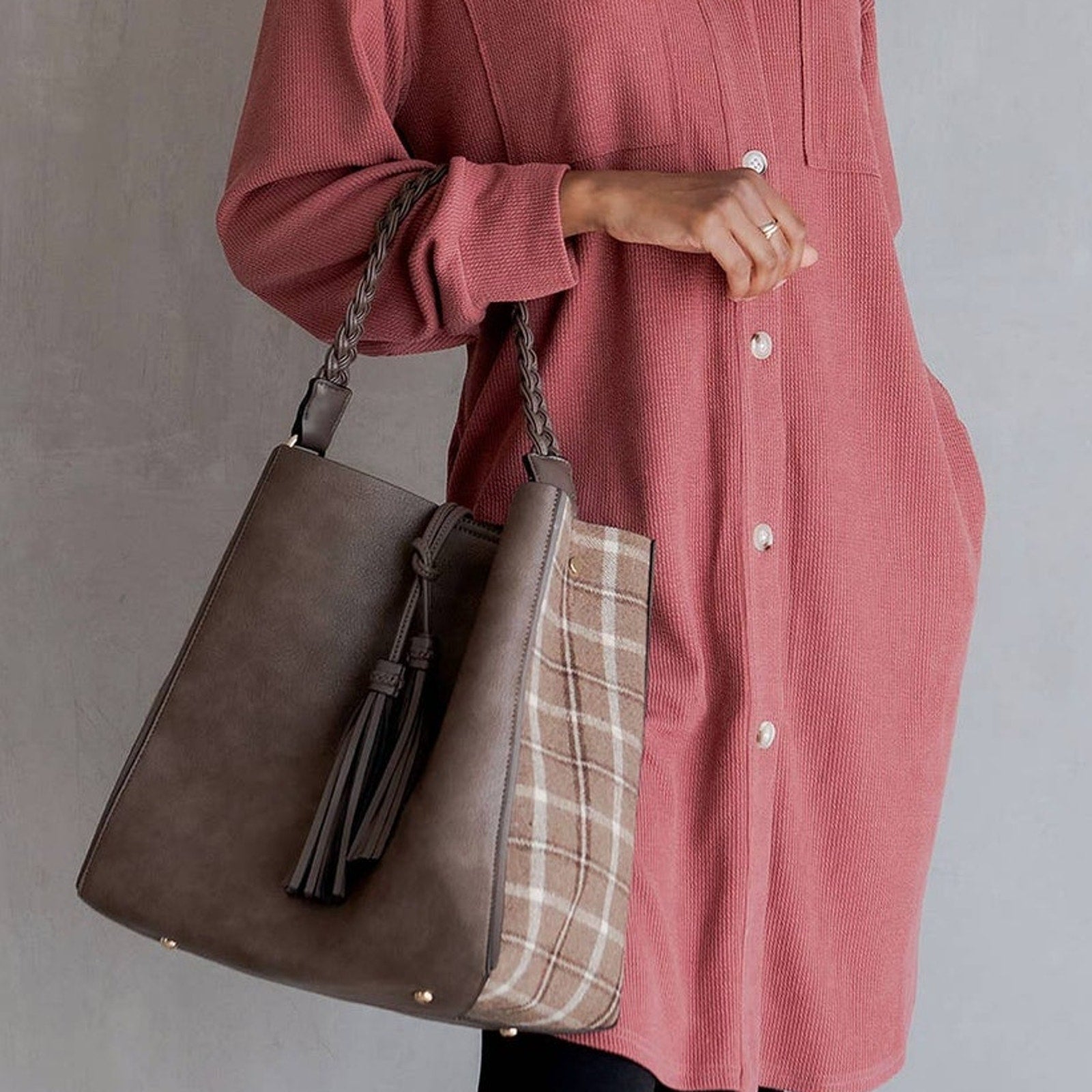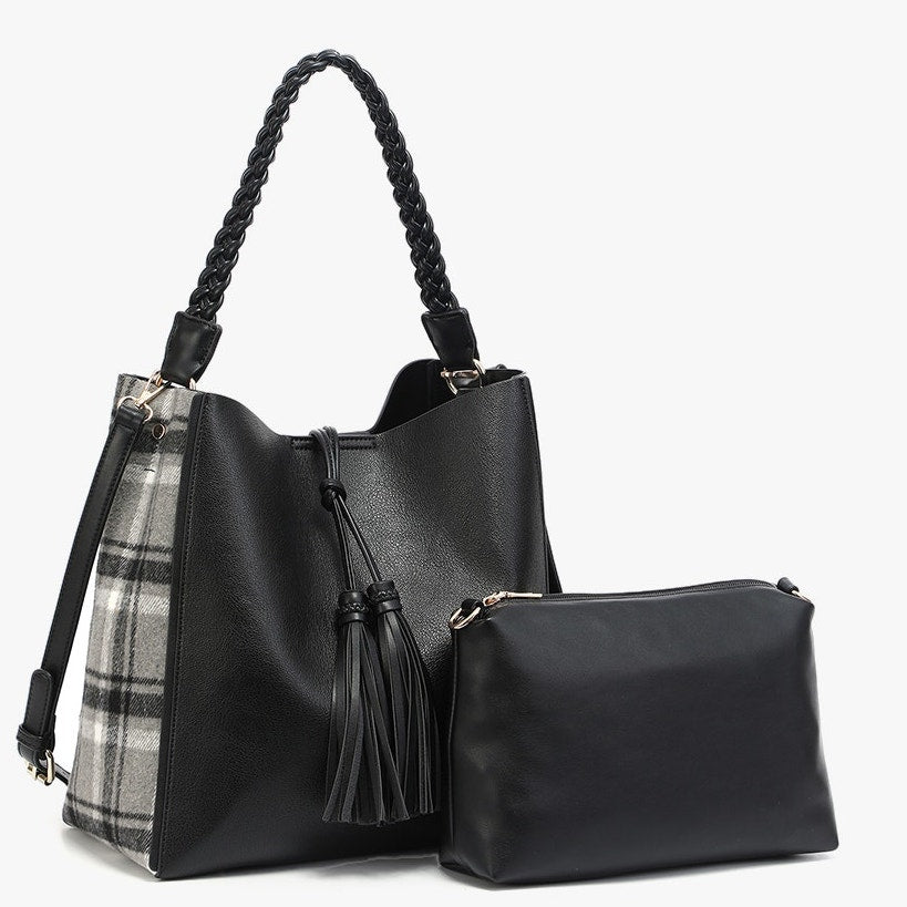 Dina Plaid Contrast Tote with Large Tassel Removable Pouch Black Grey