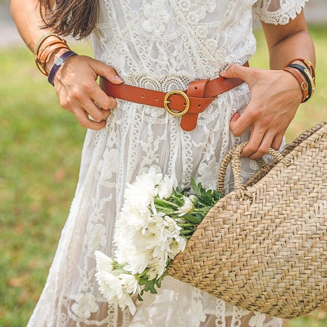 The brass-toned circle buckle leather belt is one of our wholesale and boutique best-selling belts. Made with genuine leather and a single brass-toned ring buckle, it is sure to bring out a minimalistic yet fashionable look. This classic circle buckle leather belt is a wardrobe staple, available in black, tan, camel, and white and multiple sizes to accommodate various styles from casual to formal wear. Made with genuine leather for lasting quality and timeless wear