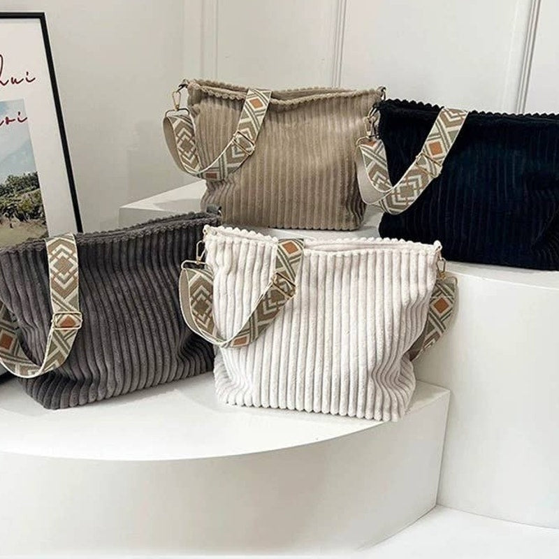 Corduroy Slouchy Tote Bag With Guitar Shoulder Strap Grey