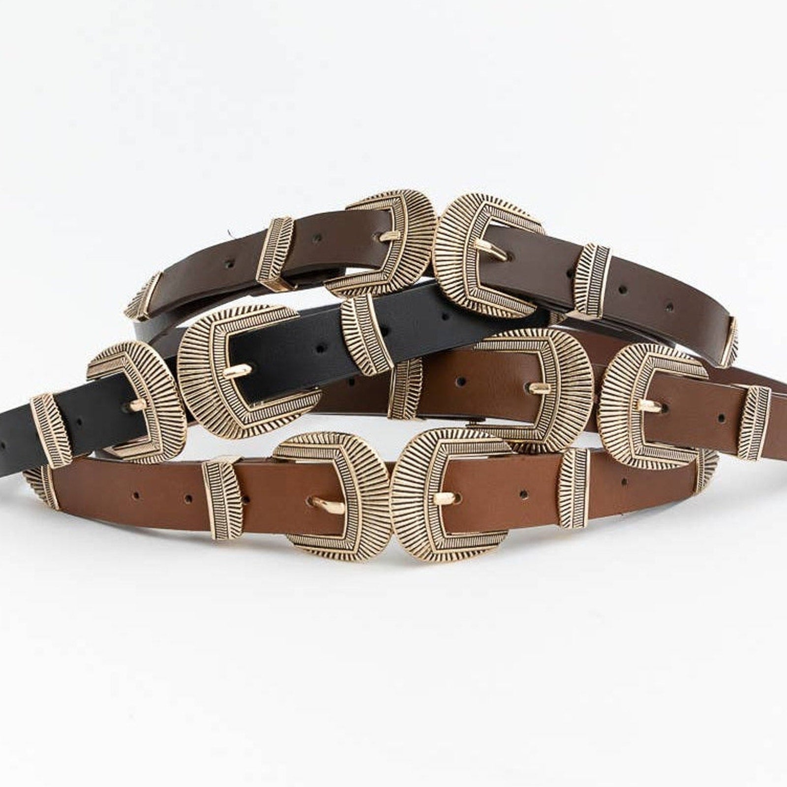 Double the buckles, double the style! Our Double Buckle Vegan Leather Western Style Belt is a statement piece that transforms any outfit. It's a durable and stylish choice. With a length of 40" and adjustable fit from XS to L (waist 24"-34"), it caters to a wide range of sizes.