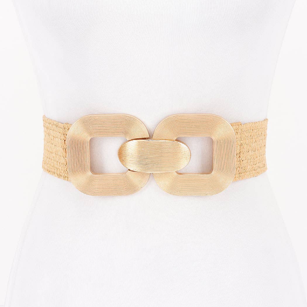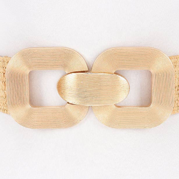 Introducing the "Metal Buckle Elastic Belt". This belt is woven with fine fibers, forming a textured surface. The buckle is composed of two approximately square rings with a connecting part in the middle, designed uniquely. Smooth surface with slightly rounded edges. The overall design style is simple, conveying a sense of fashion and nature. Elevate your style with this belt from H&D Accessories.