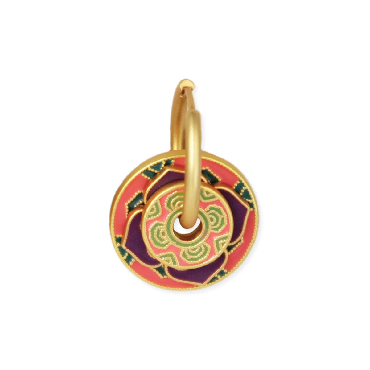 A mix and match hoop that's as stylish as it is versatile! Small gold hoops feature 3 pink tonal disk charms that can be removed to create different earring looks. Pink, purple and green enamel paired with matte gold hoops adds a soft pop of color to any look.