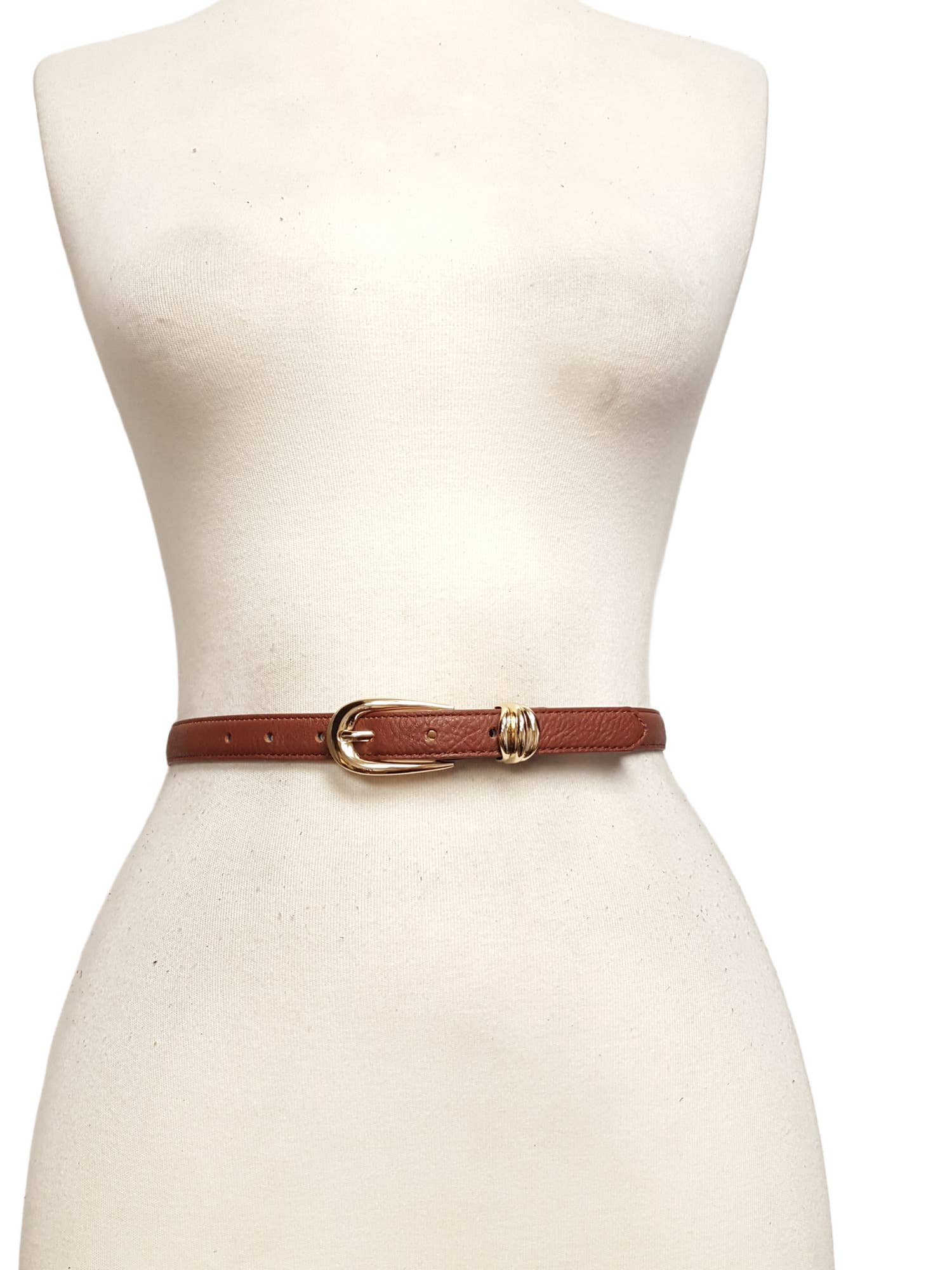 Skinny Leather Belt Shiny Gold Buckle and Loop Leather Belt Brown