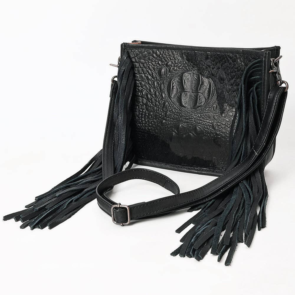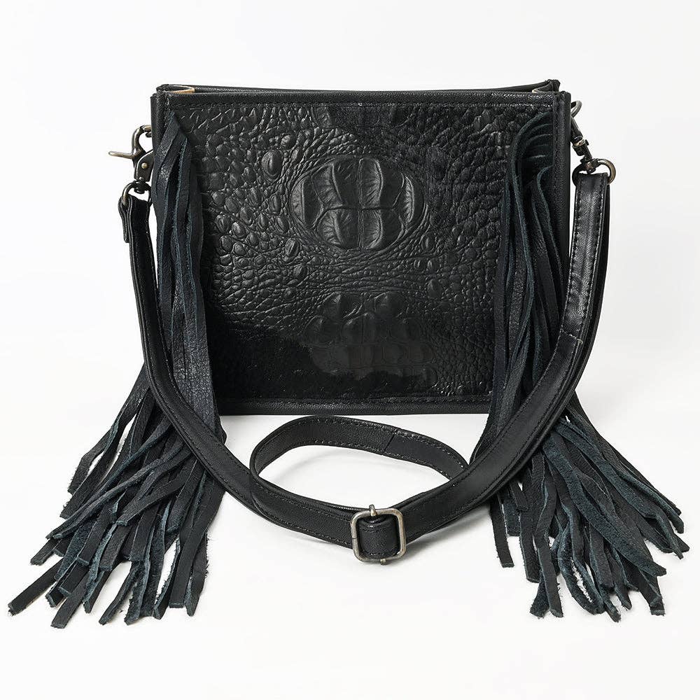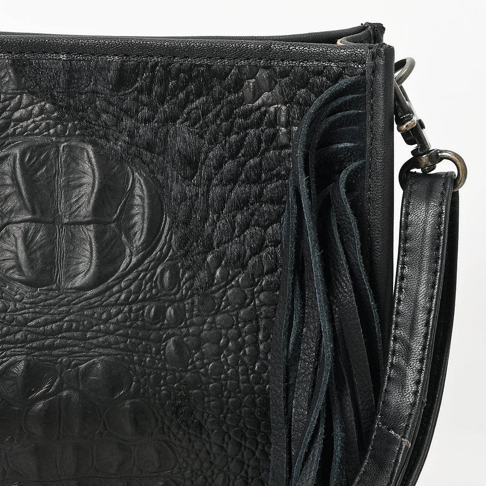 Black Croc Embossed Leather Fringe Crossbody Western Cowgirl Rodeo