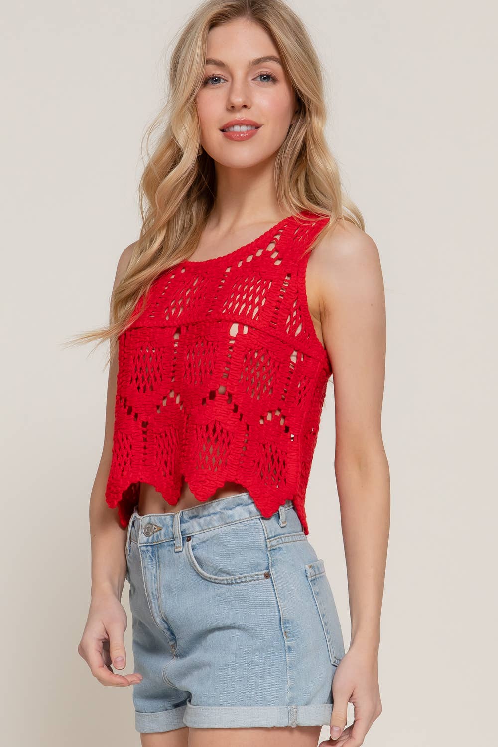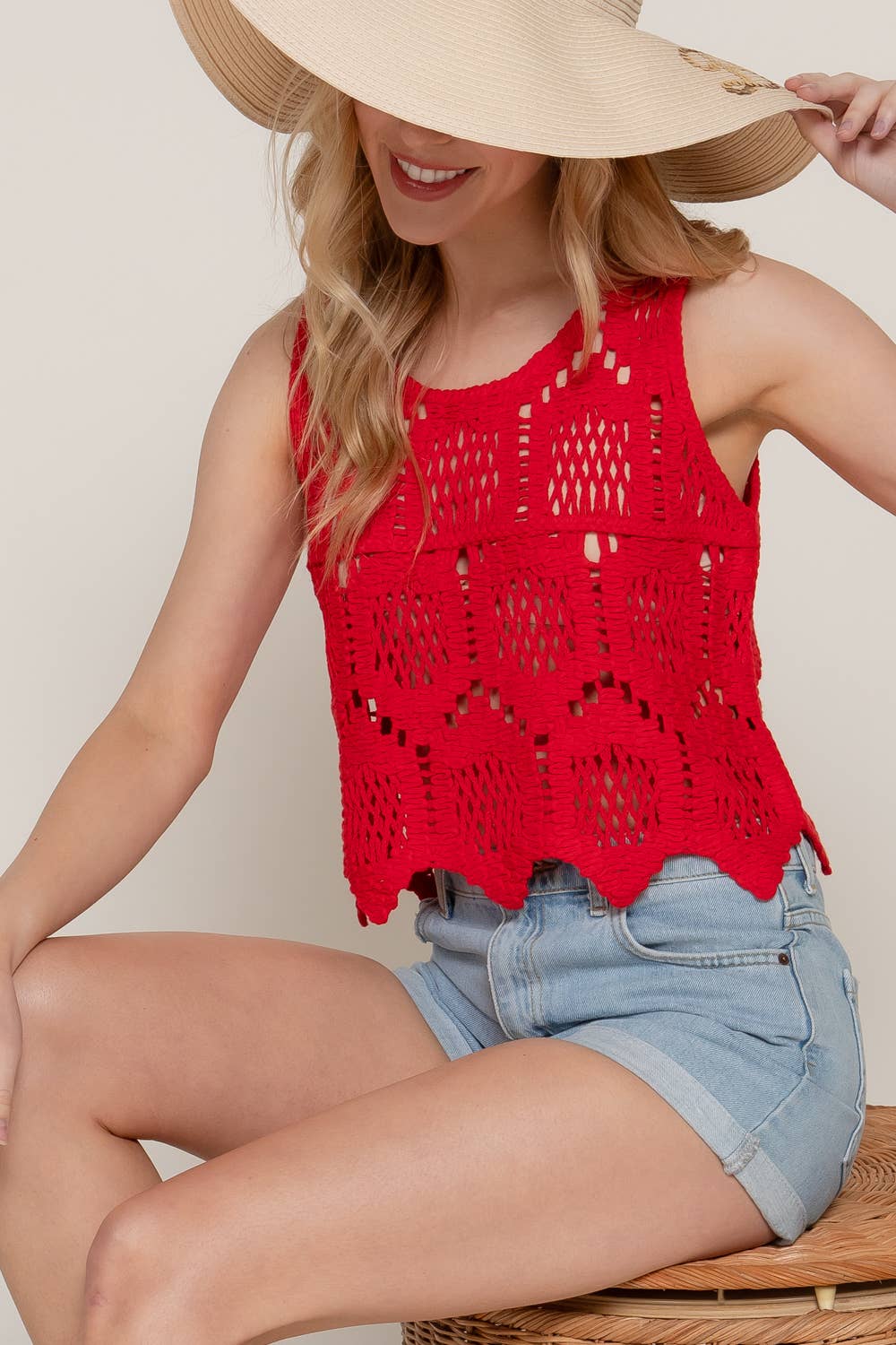 Sleeveless Round Neck Cotton Crochet Crop Tank Top Red