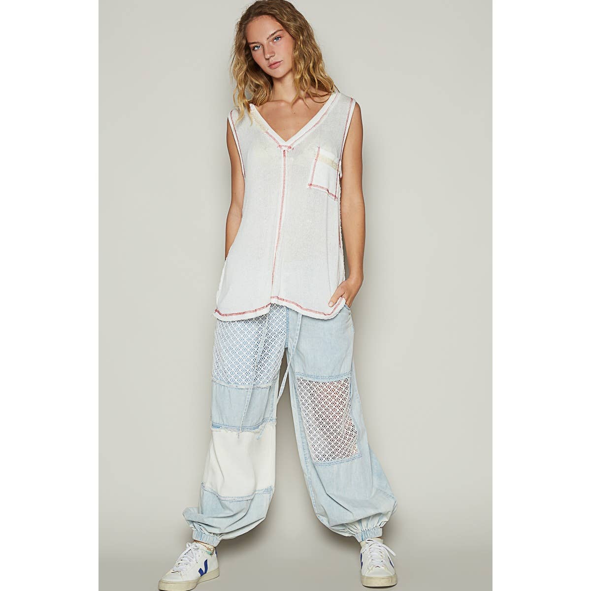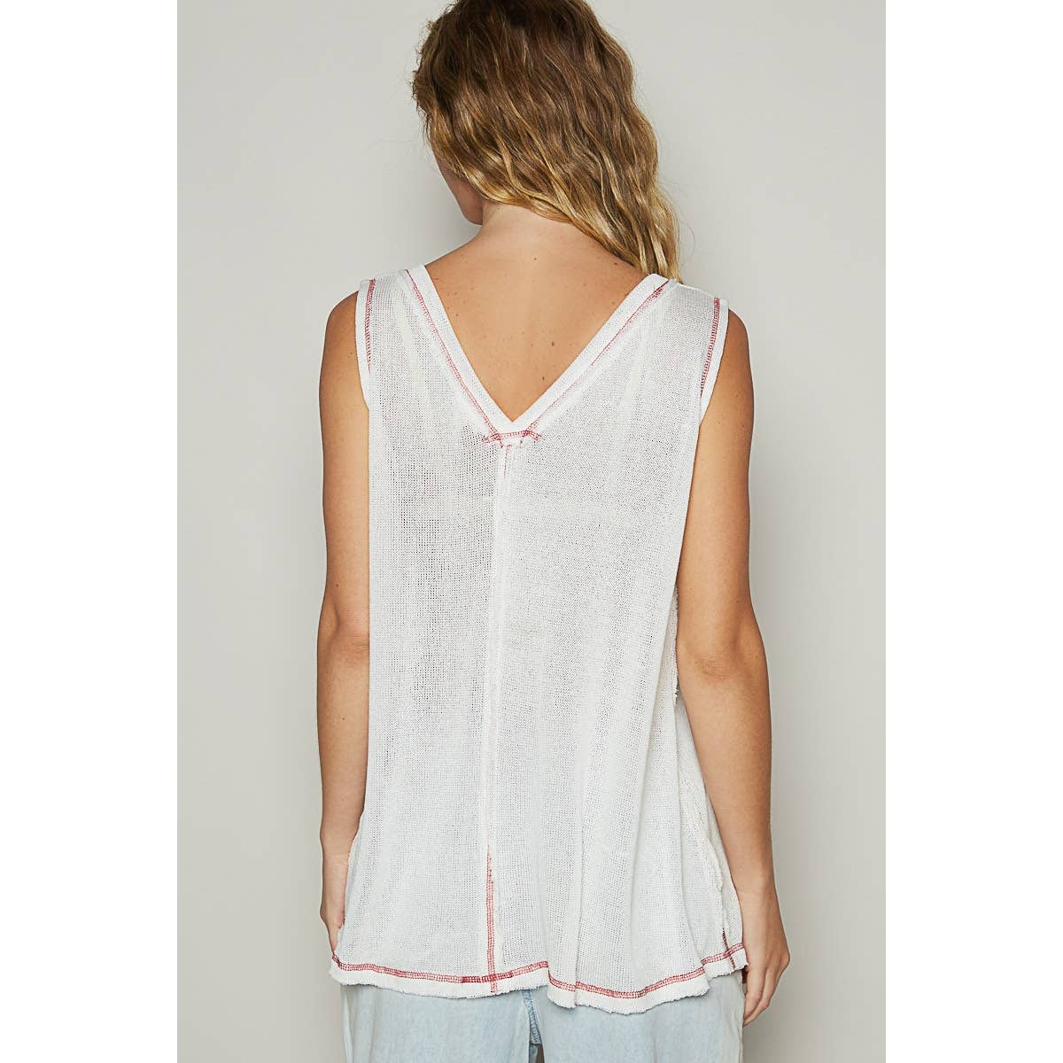 Sleeveless V Neck Front Pocket Solid Knit Tank Top Off White