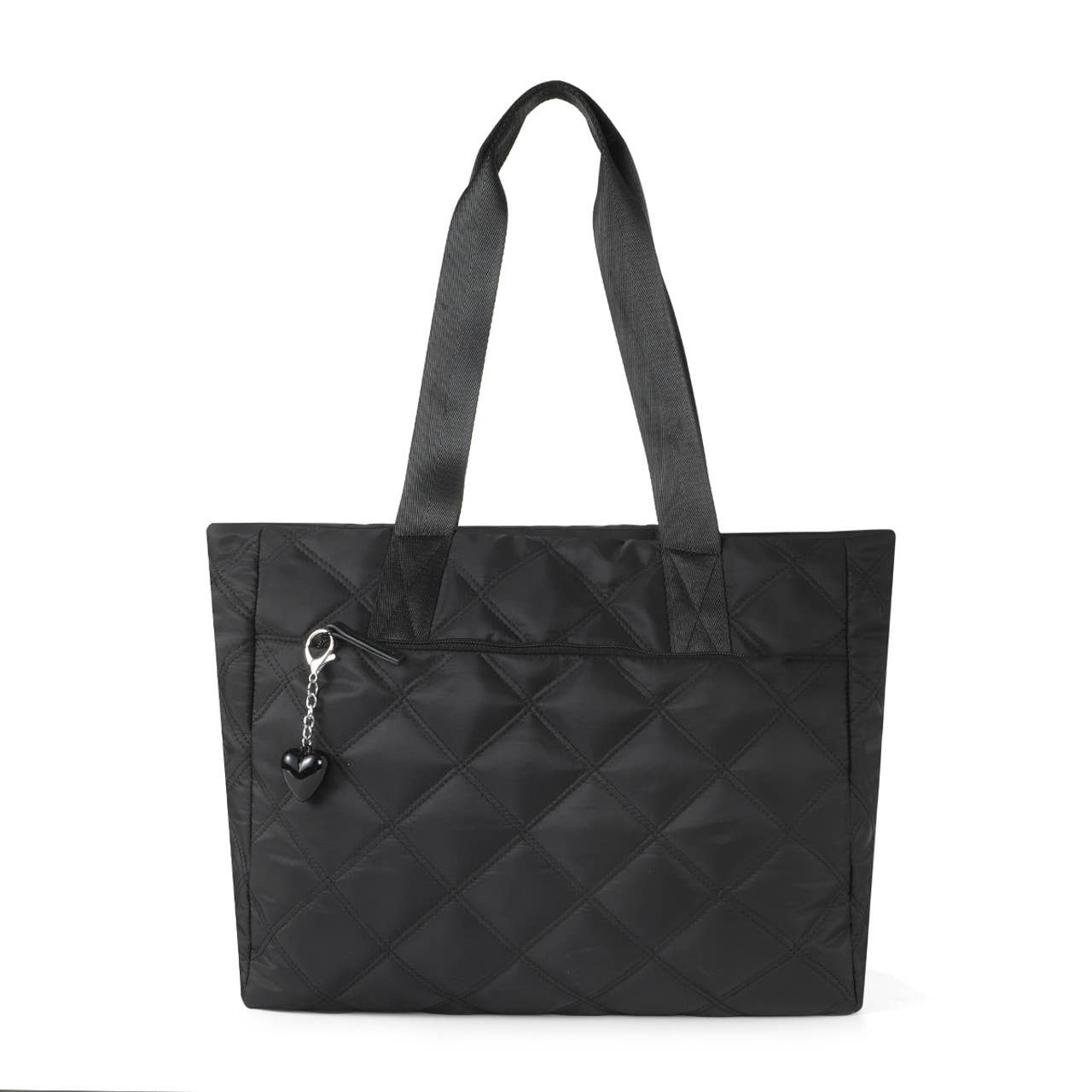 Meet the Harper Tote — where on-trend quilted puffer style meets everyday functionality. Picture the diamond-stitched nylon catching the light as you carry this sleek black tote, the glossy heart charm adding a playful finishing touch that makes it unmistakably yours.