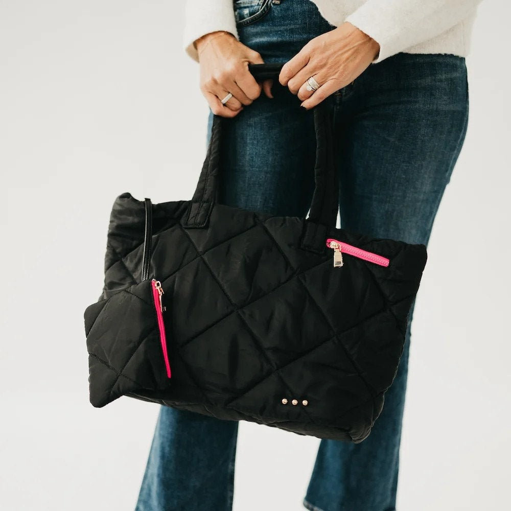 Meet your new go-to, fashionable, carry all bag - The Presley Puffer Quilted Tote Bag! This tote is perfect to wear all year round and features a front exterior zipper pocket with a coordinating color zipper lining, one interior zipper pocket, two interior open pockets, and a matching pouch attached to a pouch leash.