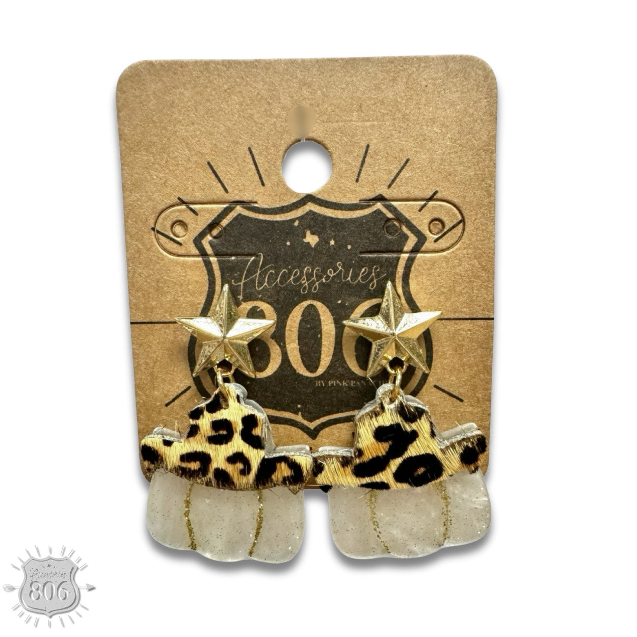 This adorable earring has an acrylic pearl finish pumpkin with an animal print cowboy hat shape above it. The pumpkin hangs from a gold tone star post.