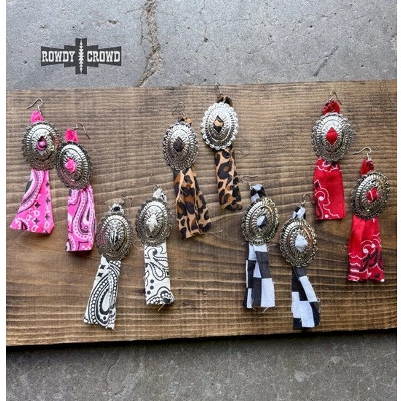 Our Concho Rodeo earrings aren't your standard earrings. Featuring various patterns and colors the bandana strand makes the concho earring pop. These are super lightweight but will add a show stopping effect to every outfit.