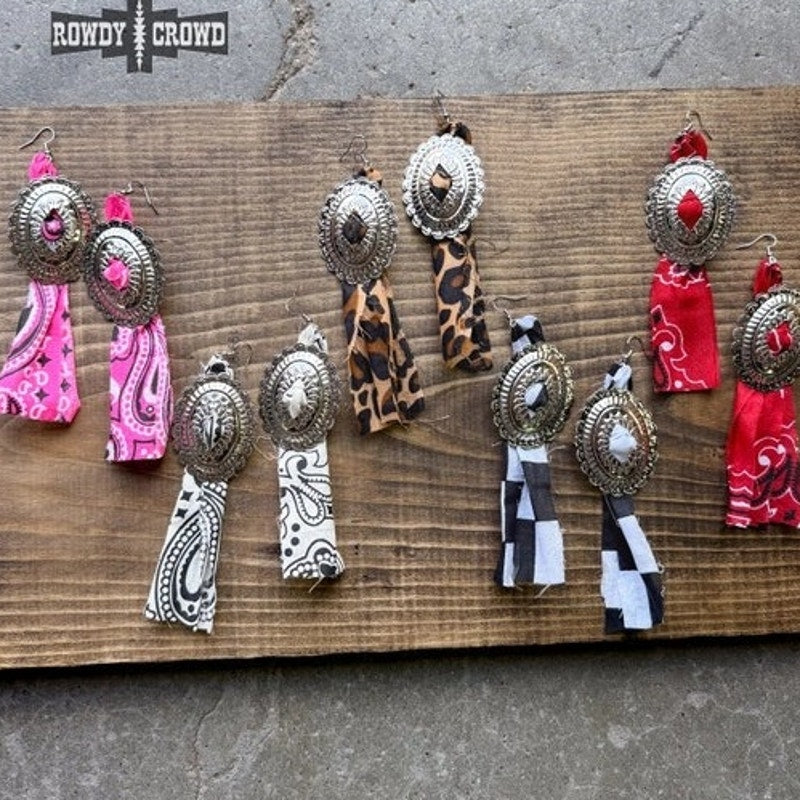 Our Concho Rodeo earrings aren't your standard earrings. Featuring various patterns and colors the bandana strand makes the concho earring pop. These are super lightweight but will add a show stopping effect to every outfit.