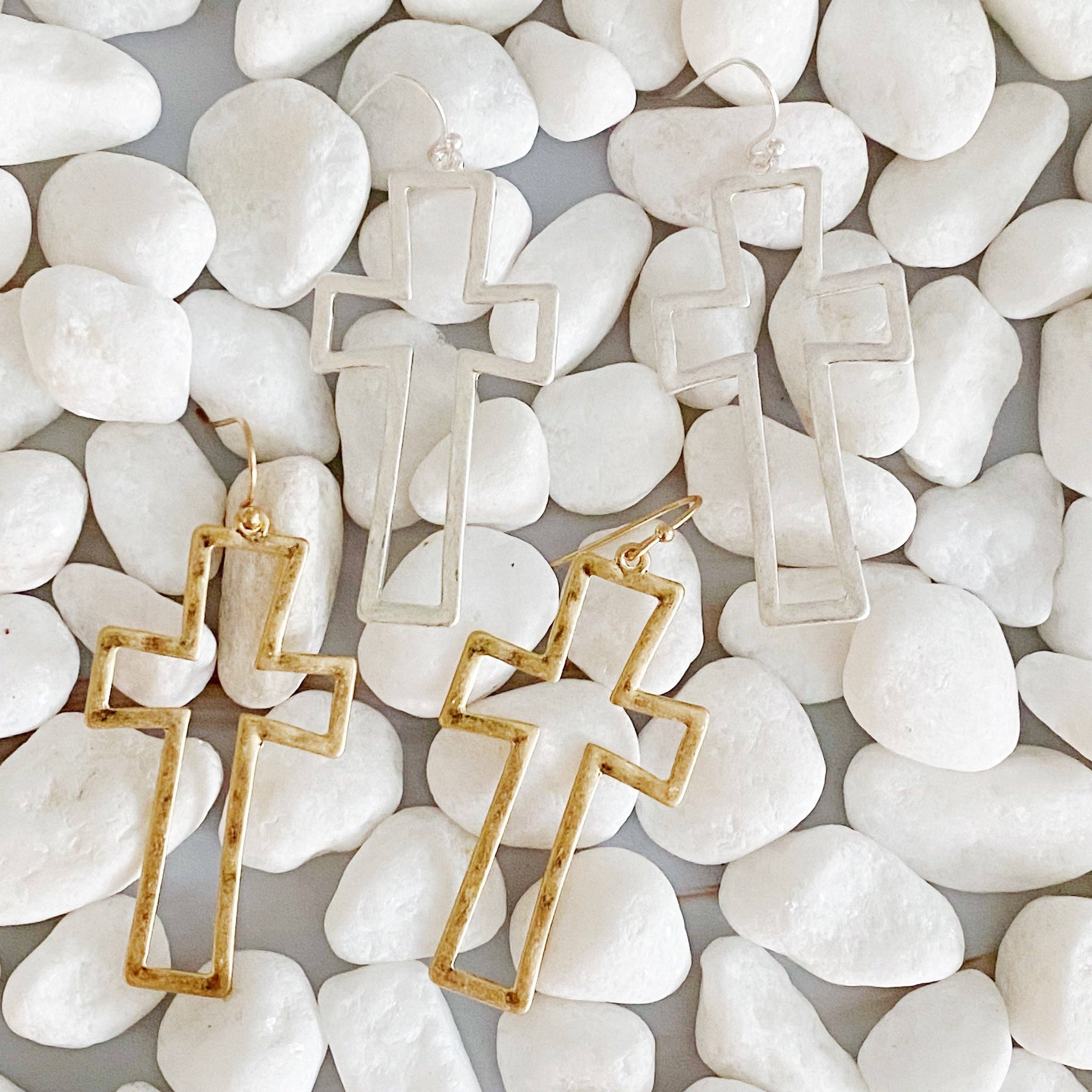 These Dangle Cross Earrings are sure to add the perfect amount of edge to any outfit. Crafted with a hammered matte finish, they are lightweight yet robust for all-day wear. Their eye-catching cut out cross design makes them stand out from other statement earrings.