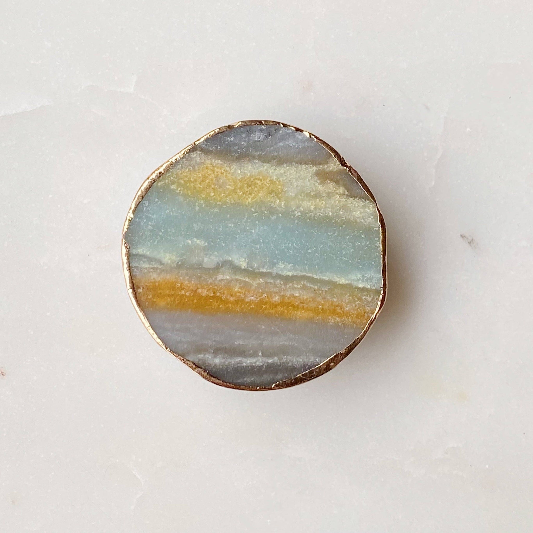 Mobile phone and tablet grip/stand. Beautiful natural stone slice with a handle/stand has both a trendy look and plenty of functions! Having a piece of nature feels always nice! Each piece may have a slightly different color and  size due to the characteristics of natural stone. Stones measure 2 inch - 2.5 inch diameter irregular round or oval shape. Has golden trim around and it adds even more charm!
