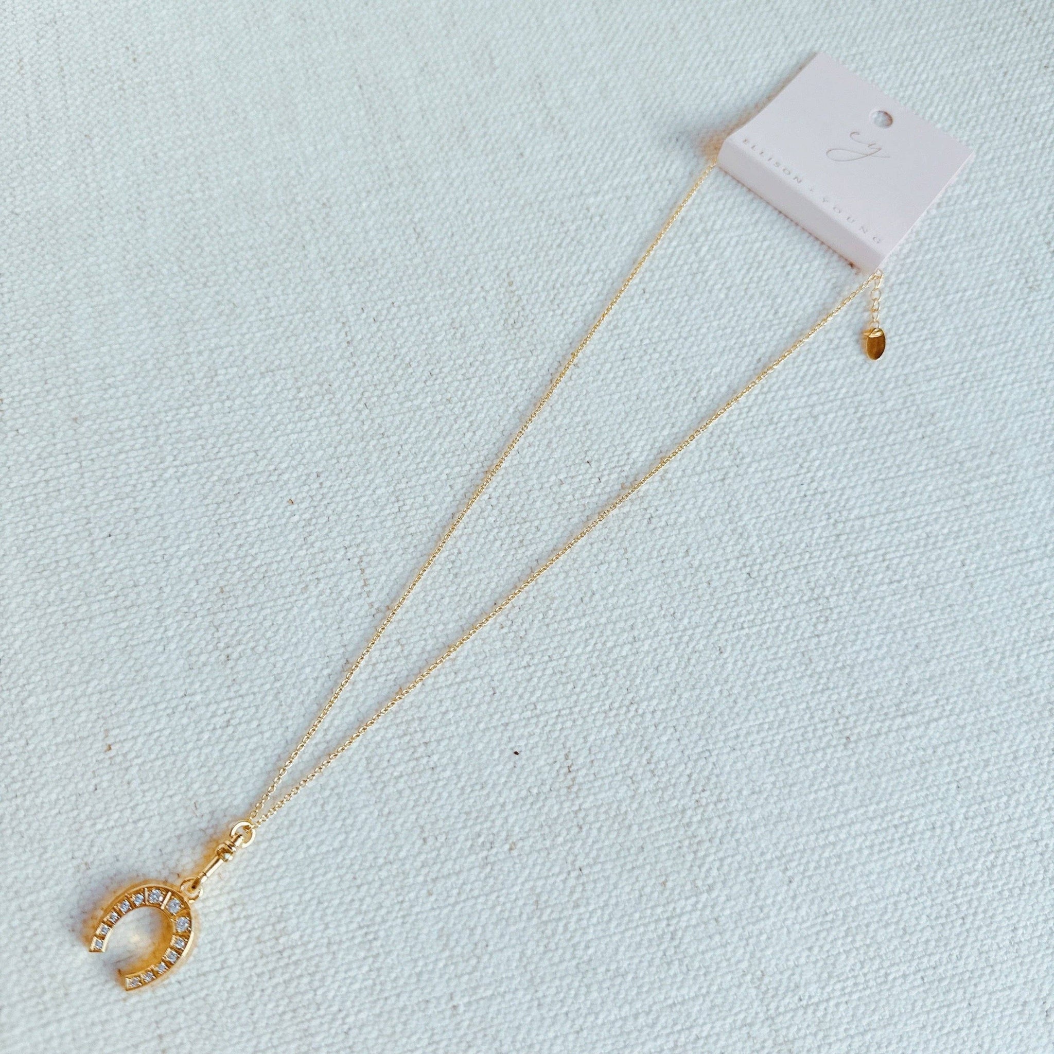 This pendant necklace features a modern and unique design with a paved horseshoe pendant. A complementary chain is included for added elegance.