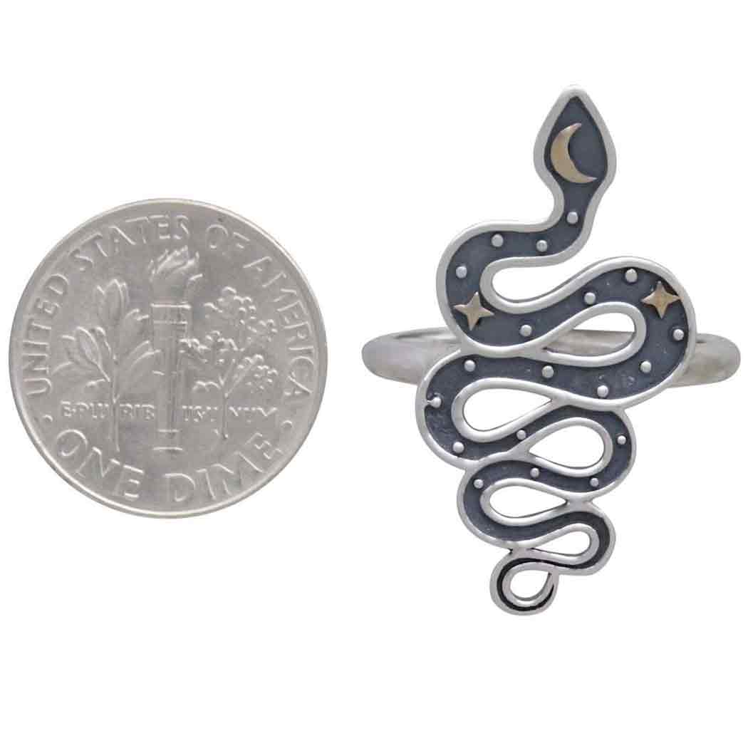 Artisan Celestial Sterling Silver Snake Ring with Bronze Star and Moon