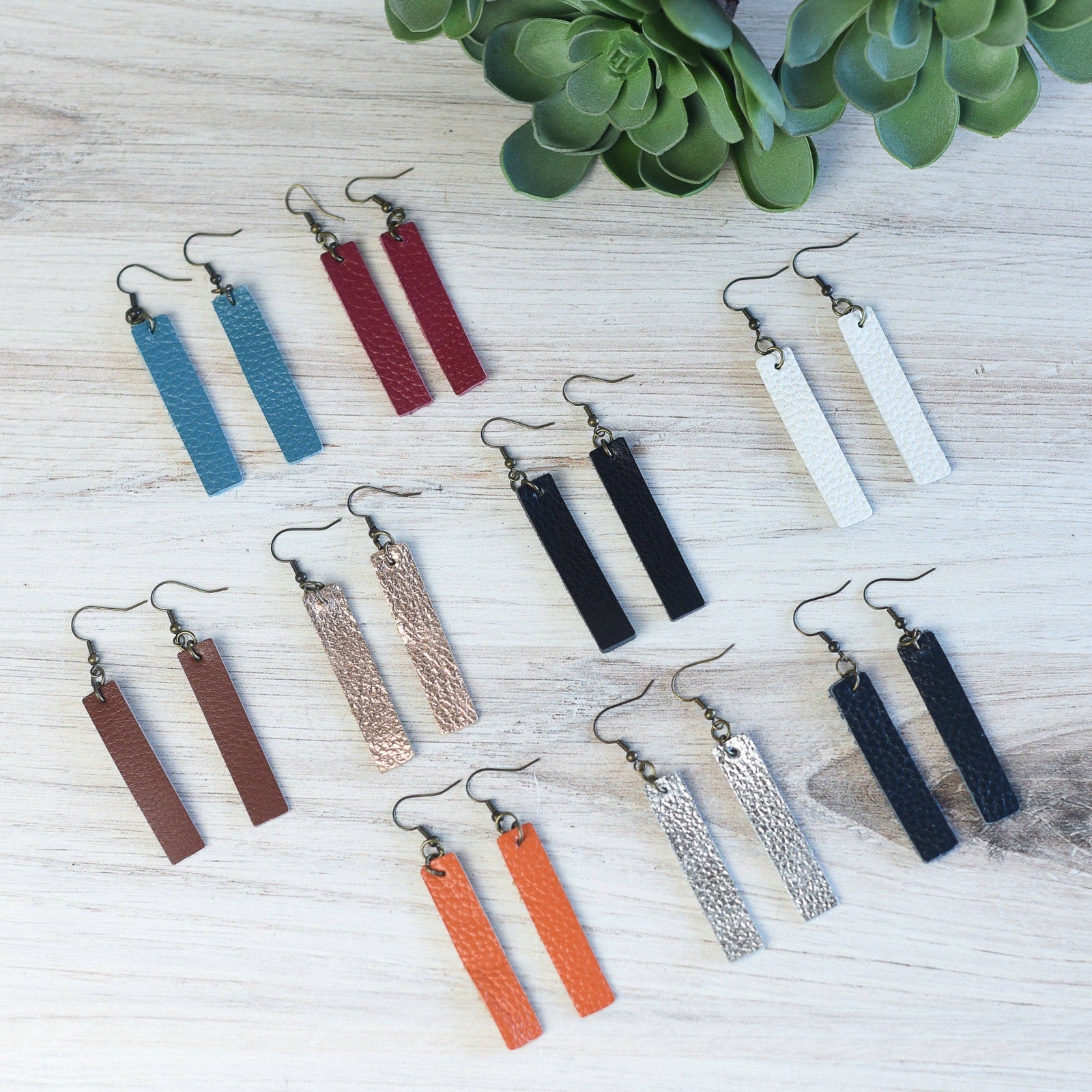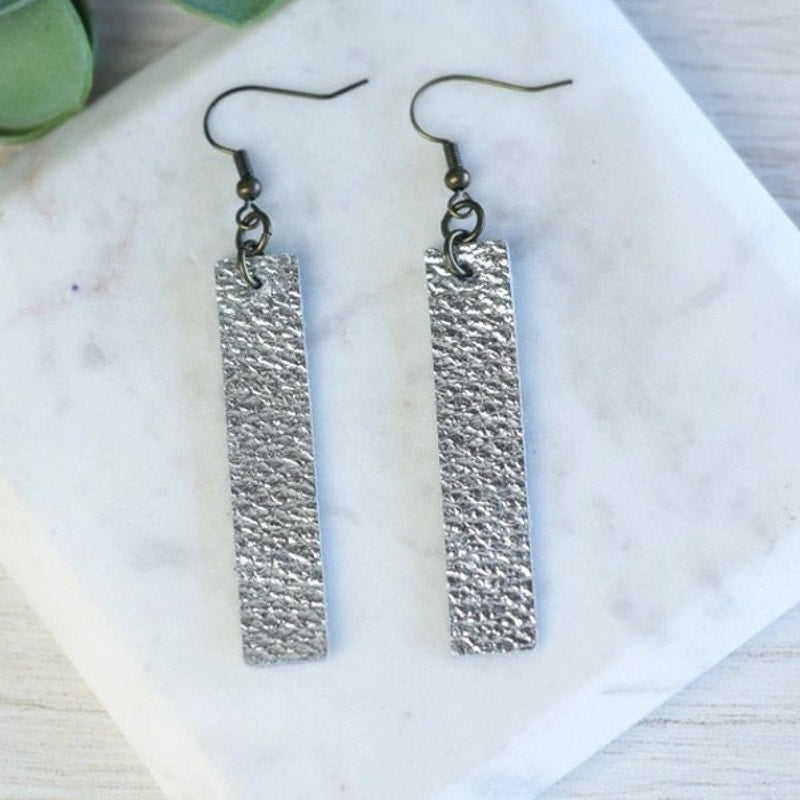 Genuine Leather Rectangle Drop Dangle Earrings Silver