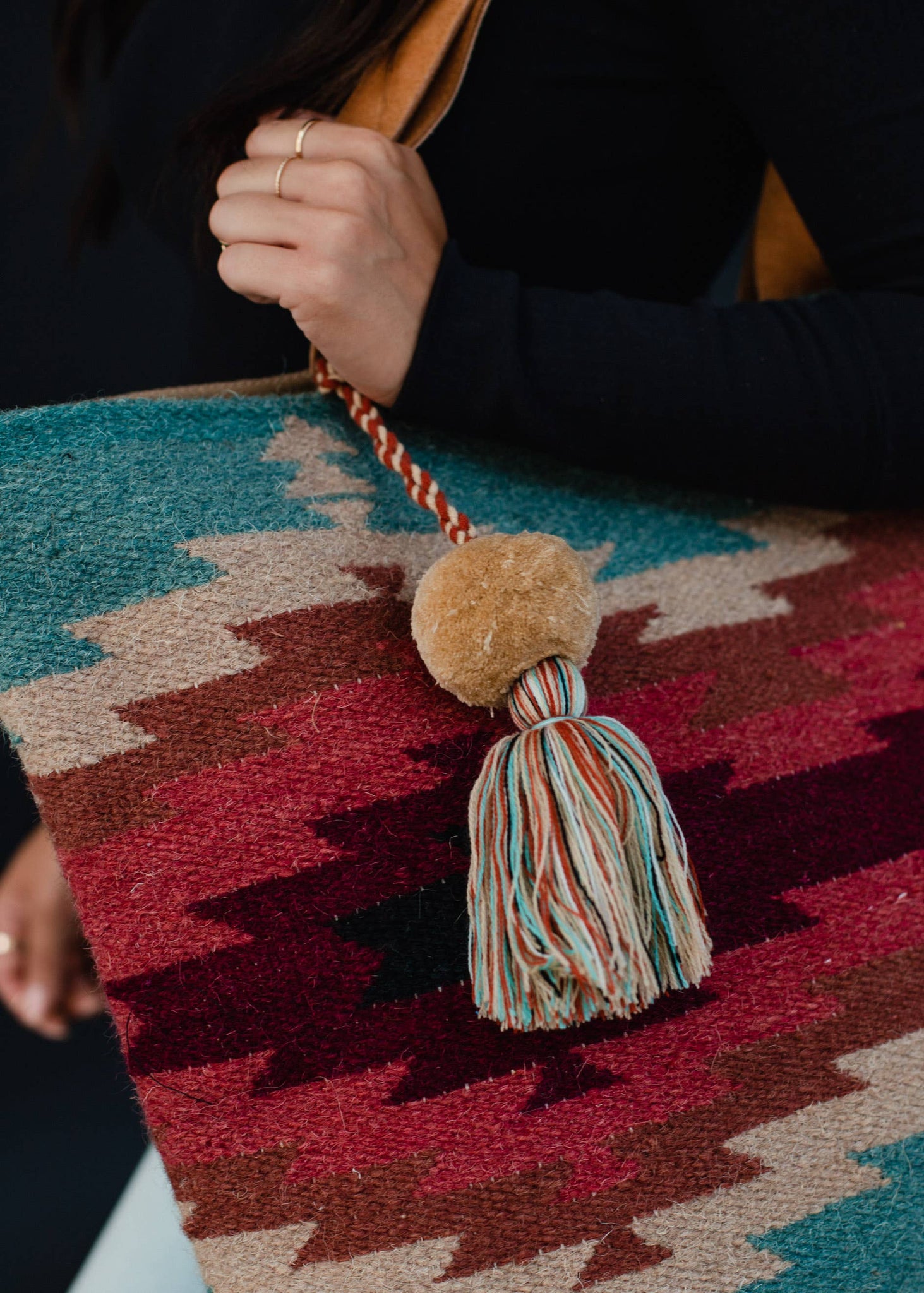Multicolored pom tassel detail