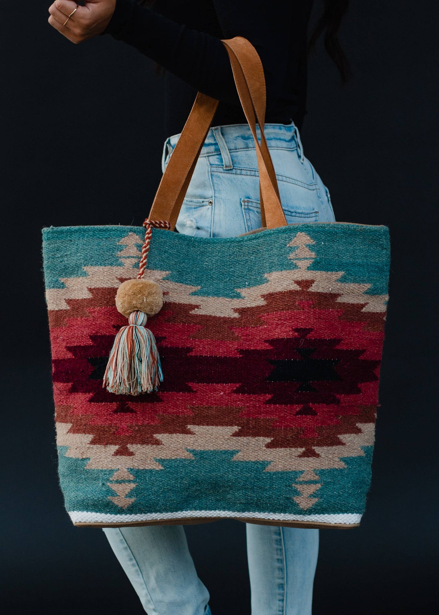 Cotton Wool Woven Teal Burgundy Tan Western Southwestern Aztec Tote