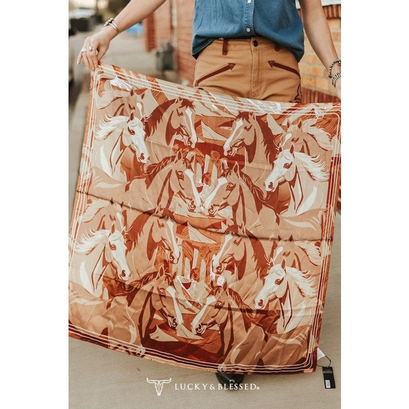 This stunning western wild rag showcases an allover running horse design layered in rich brown, tan, and ivory tones for a timeless western look. The detailed equine artwork creates movement and depth, making this wild rag a true statement accessory. Crafted from a lightweight, silky fabric with a smooth drape, it's easy to style around the neck, worn as a head scarf, or tied to handbags for added western charm. A versatile piece that pairs effortlessly with denim, boots, and classic cowgirl outfits, this wild rag offers strong visual impact with everyday wearability.