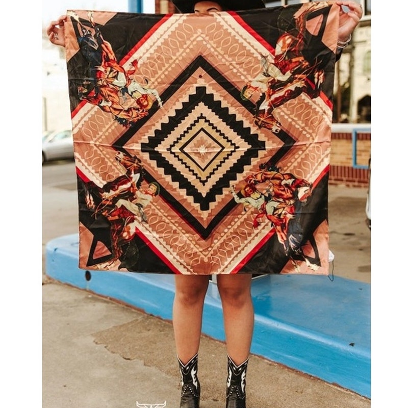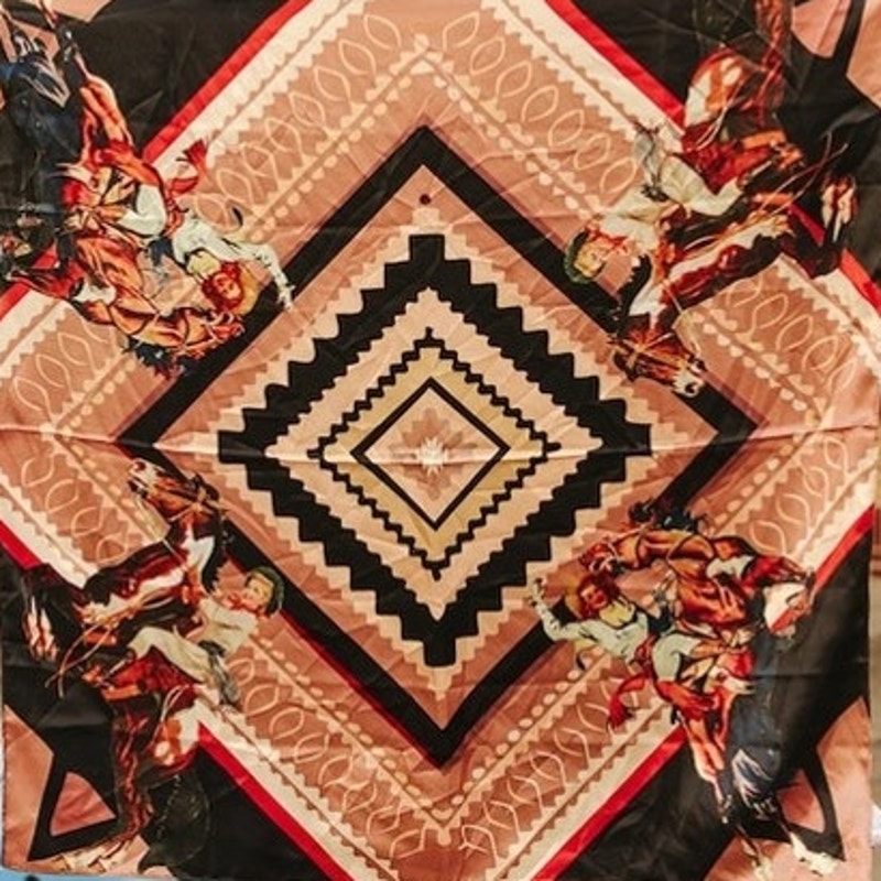 This bold western wild rag features dynamic vintage rodeo artwork framed by layered Southwestern diamond geometry for a powerful, statement-making design. Illustrated cowboys in motion anchor each corner, bringing authentic western energy and movement to the piece, while warm neutrals of tan, saddle brown, black, and touches of red create depth and contrast. The center diamond motif adds a classic Southwest feel that pairs effortlessly with cowgirl apparel, rodeo looks, and western accessories.