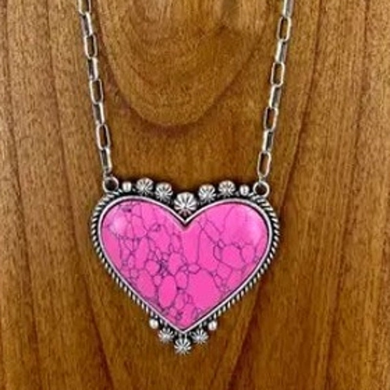 26 inches Pink stone heart necklace with paper clip shape silver metal chain