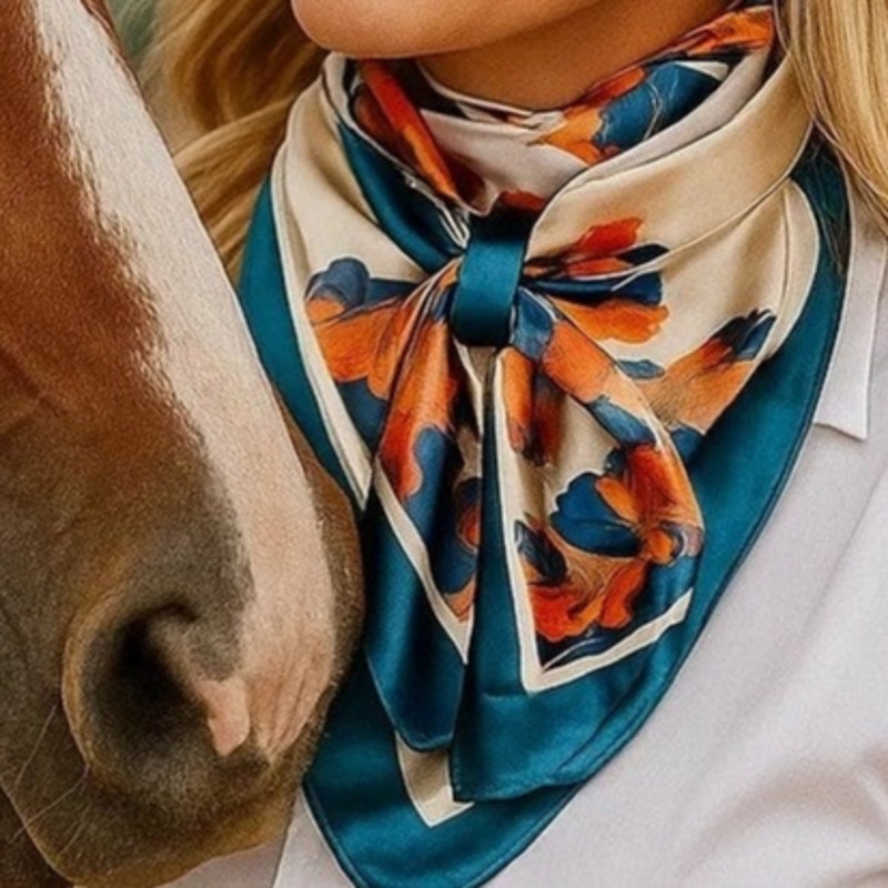Our classic wild rag/scarf in teal and white floral pattern. It is a square and measures 35" x 35". It is sure to add a bright pop of color to any outfit.