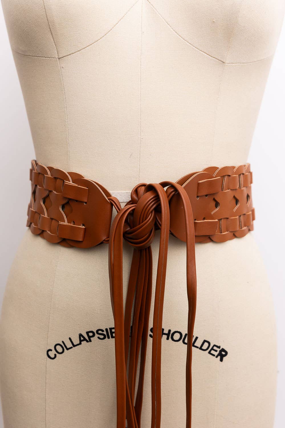 Wide Woven Vegan Leather Belt - Camel Brown Tie-Up Waist Belt