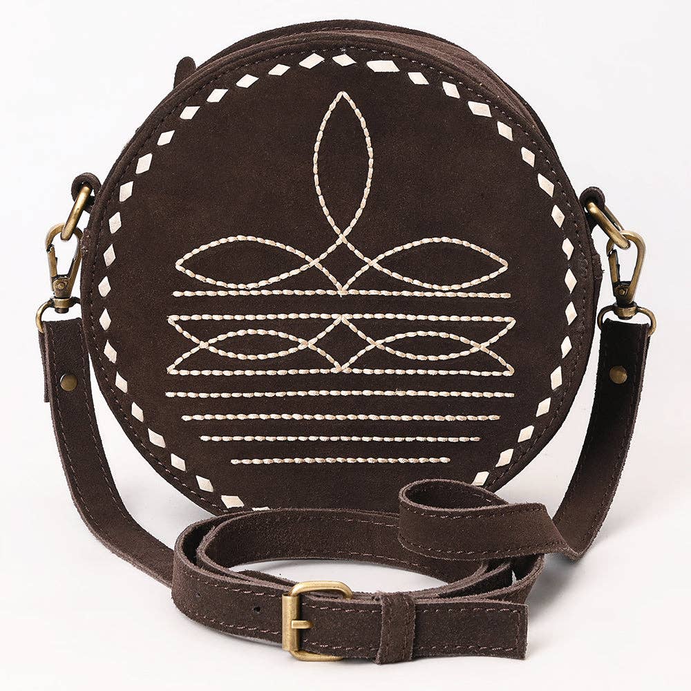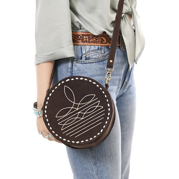 Feel the supple, quality leather and admire the meticulous stitching that makes this bag a true standout piece. The round canteen shape is both eye-catching and functional, offering just the right amount of space for your daily essentials while keeping your hands free. Whether you're two-stepping at a honky-tonk, exploring a music festival, or running errands with Western flair, this crossbody delivers authentic style.